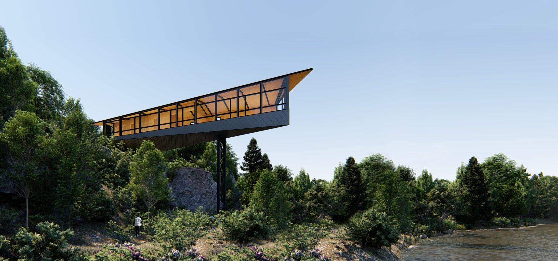 We’re extremely excited to be wrapping up the last stages of construction on one of our most unique projects to date—a cross-laminated-timber (CLT) cabin that projects off the side of a mountain, 20 metres above a lake in La Pêche, Quebec.