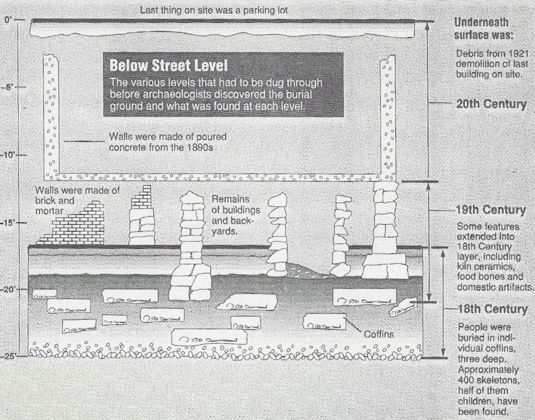 In the 18th century, 30′ of fill was placed over the existing burial places to level the ravine that constituted the ABG. For this reason, subsequent construction foundations were nearly always still above the bodily remains.
