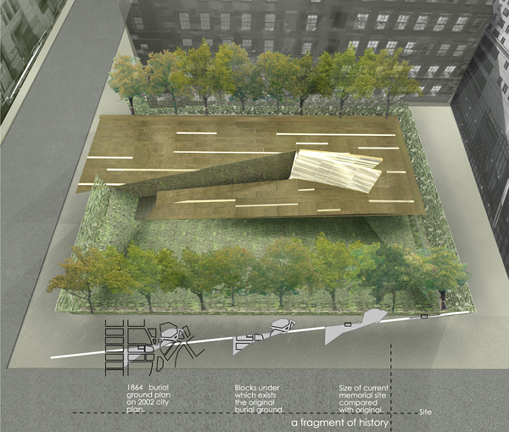 Most of the original burial ground’s five-acre site will remain forever beneath existing structures, however, a federally-sponsored national design competition set aside approximately 10,000 square feet on the federal building’s site for the construction of a memorial.
