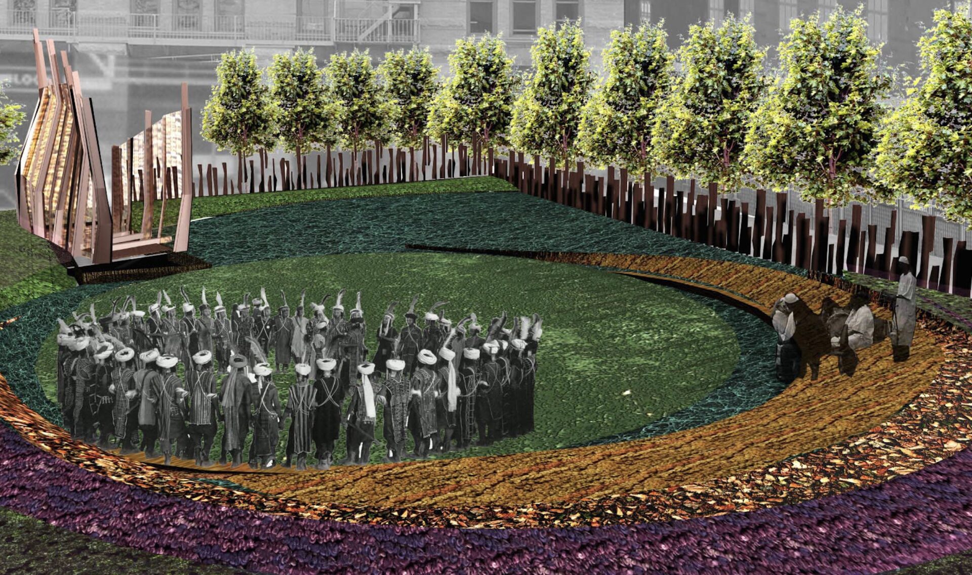 The proposal envisioned an extensive tree-planting initiative along all streets and available outdoor public spaces to define and honor the full extent of the African Burial Ground. This living boundary would reinforce the site’s sacred significance while creating a natural sanctuary for reflection. At the entry of the memorial, the Bronze Shroud would bear inlaid place names, symbols, and maps, telling the story of the ancestors and the African diaspora. Surrounding the Ceremonial Lawn, a vibrantly planted Memorial Garden would mark the area of re-interment, providing a space of beauty and reverence where visitors could gather, remember, and honour those laid to rest.