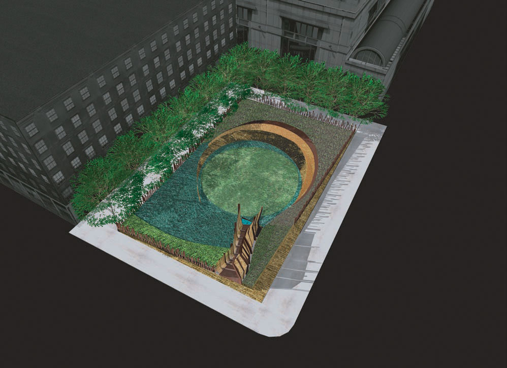 This initial design proposal envisioned a sacred sanctuary within the urban landscape, evoking both remembrance and renewal. Inspired by the image of a clearing within a grove, the memorial would recall the forests that had historically served as places of refuge for those fleeing enslavement. Lush plantings would mark the full five-acre extent of the burial ground, ensuring its presence could be felt throughout the cityscape.