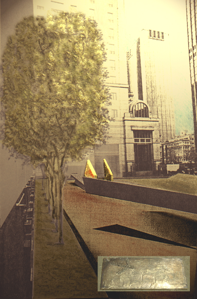 The entrance to the “grove” is marked by a tall passageway ramping down from the sidewalk, fabricated of steel and a tapestry of brass and bronze “ribbon” that calls to mind African patterns (made to help divert menacing forces). A required perimeter fence made of smaller, rough steel elements calls to mind broken branches signifying the vast number of the deceased, but these stand in dialogue with the hope proffered by the grove at the back of the site.