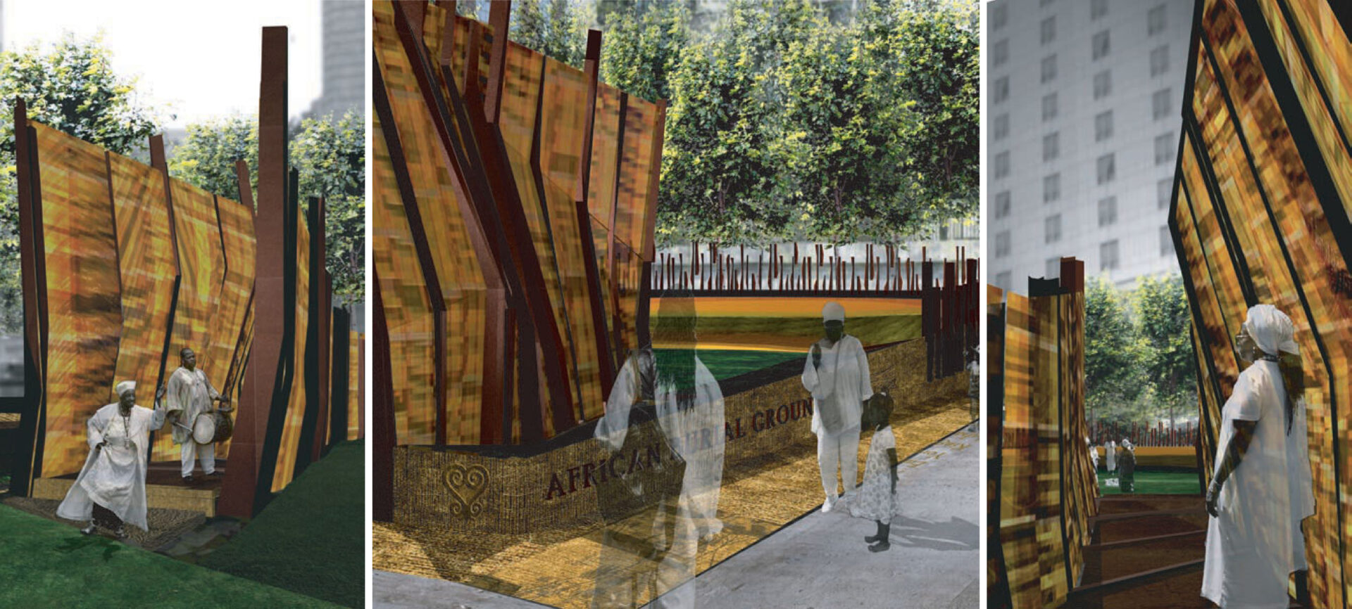 The entrance to the “grove” is marked by a tall passageway ramping down from the sidewalk, fabricated of steel and a tapestry of brass and bronze “ribbon” that calls to mind African patterns (made to help divert menacing forces). A required perimeter fence made of smaller, rough steel elements calls to mind broken branches signifying the vast number of the deceased, but these stand in dialogue with the hope proffered by the grove at the back of the site.