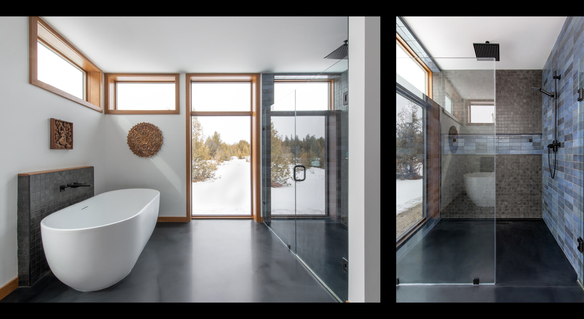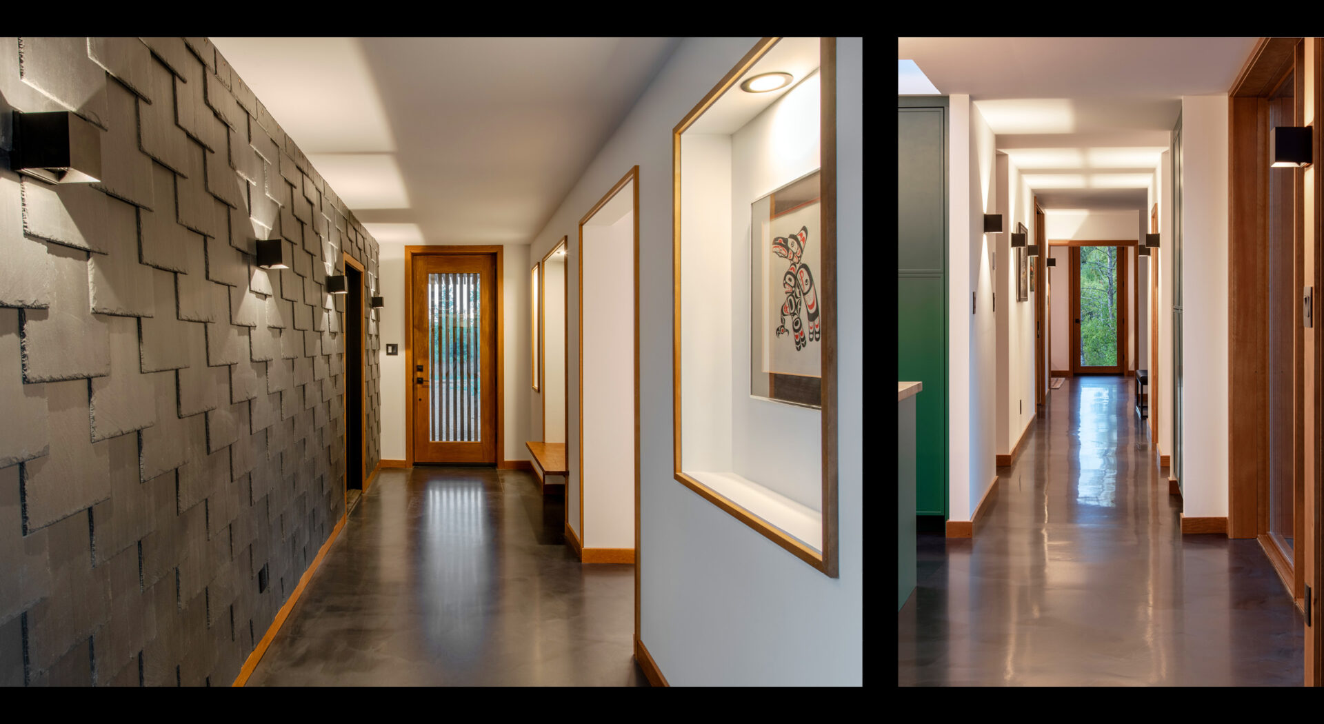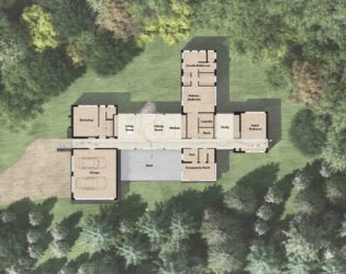The home’s exterior is clad with variegated wood siding to help dematerialize the solid portions of the design and local slate, which also extends into the home’s foyer. The roof will be planted with sedums and features an extensive sculptural array of scuppers, which in addition to providing drainage, serve to amplify the sound of summer rainfalls.