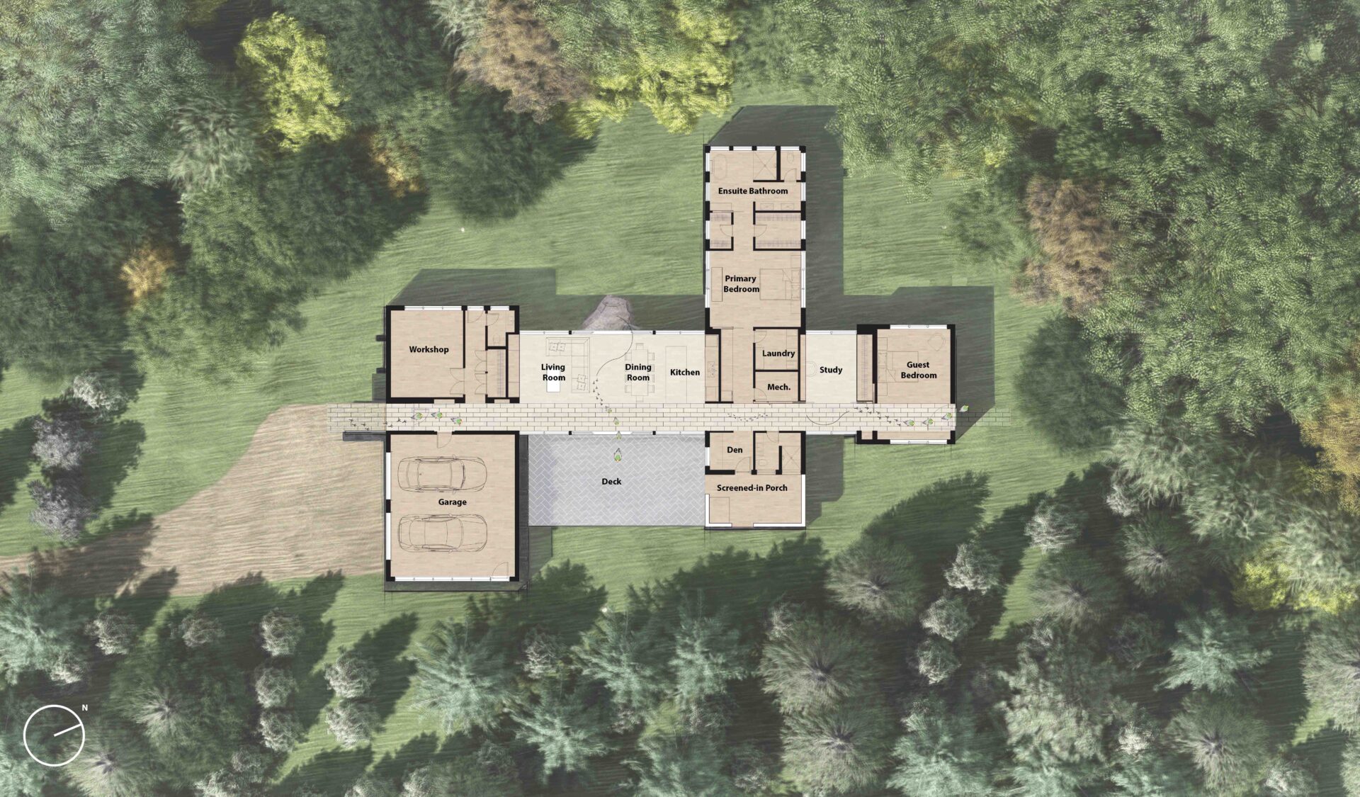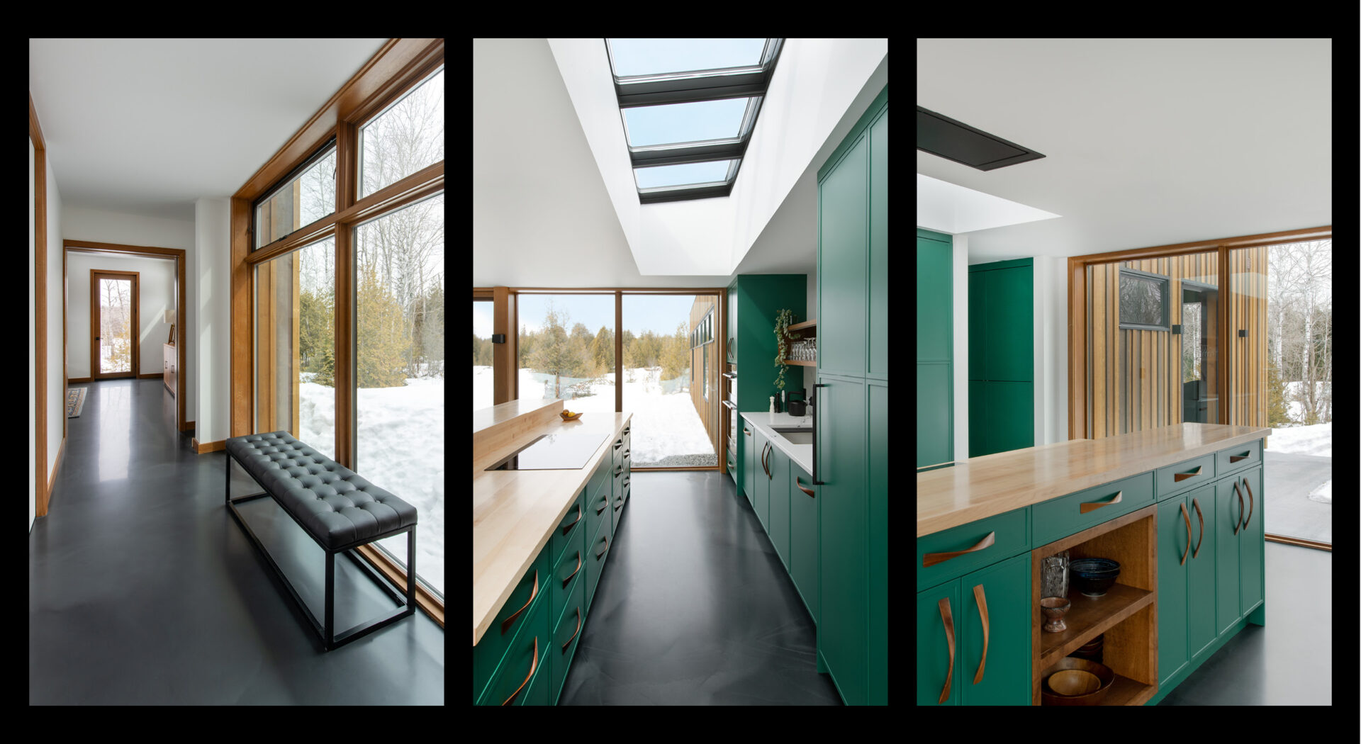 Since the quality of the surrounding landscape changes greatly as the sun strikes the coniferous trees to the east or the deciduous trees to the west, the home is oriented closely to the cardinal points. In this way, the glazed spatial links – observatories — between the solid pavilions receive a dynamic light show around the clock and throughout the seasonal changes. And, since different animal species also follow different diurnal and seasonal patterns, there is a constant engagement with the new neighbours.