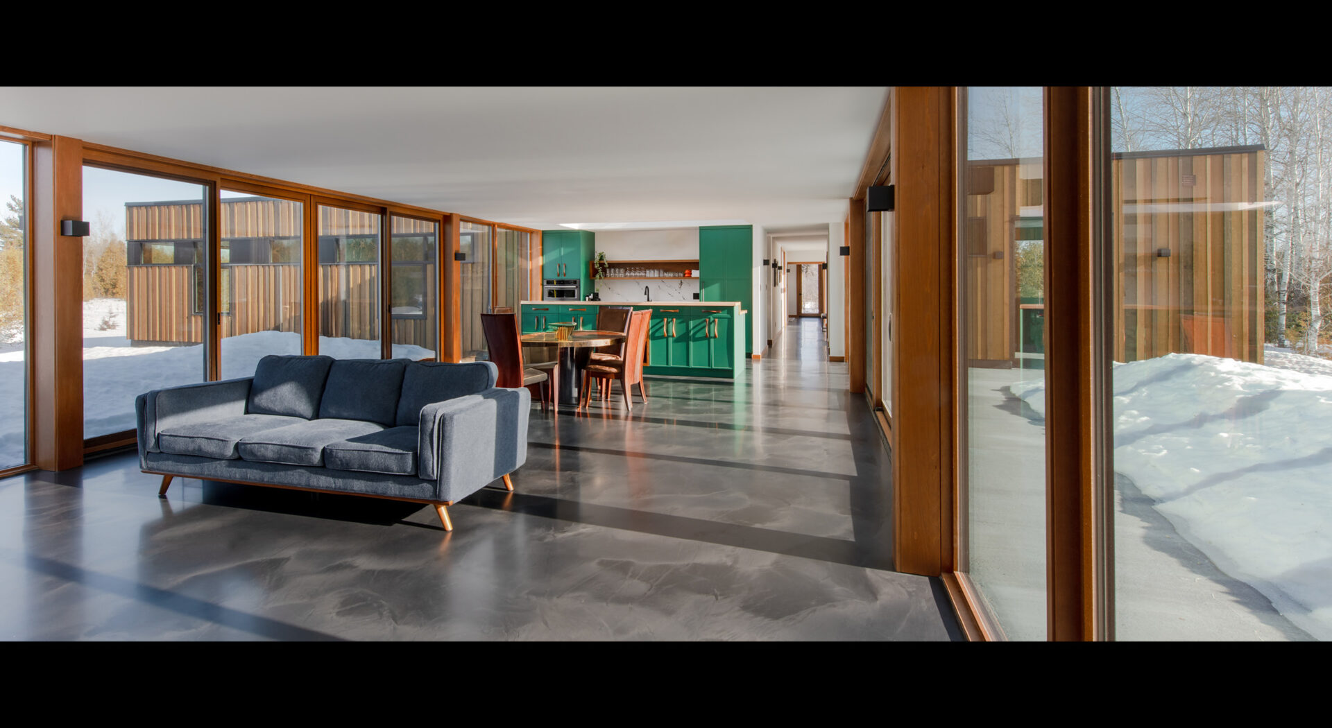 The home they built for themselves is set far away from the sole road in the area. In order to further reduce its scale (its living area totals just over 3,000 square feet), the home is broken down into three pavilions, separated by glassed-in zones, that simultaneously serve as primary living areas and, moreover, observatories for the surrounding wildlife and ever-changing vegetation. Whereas others might have sought to have a tall home to tower over the land and its natural inhabitants, here, the design’s single-storey, very low profile furthers the home’s deference to the natural landscape. Likewise, the single storey ensures accessibility, enabling the clients to remain despite the challenges brought on by aging.
