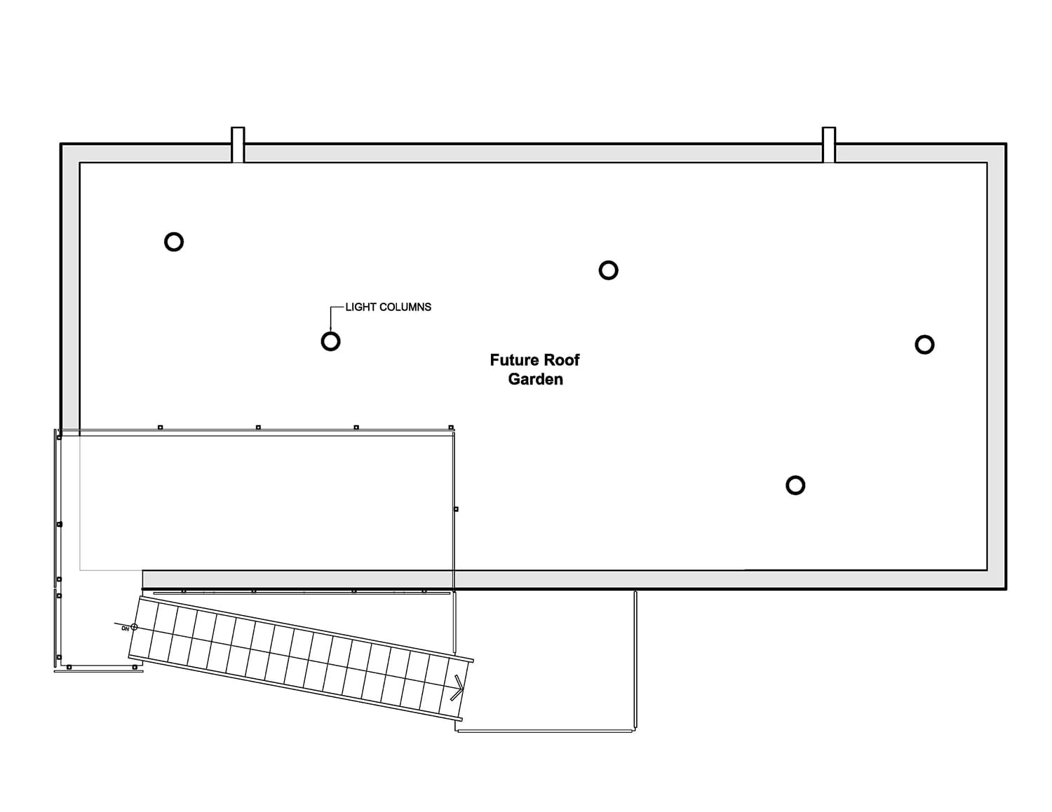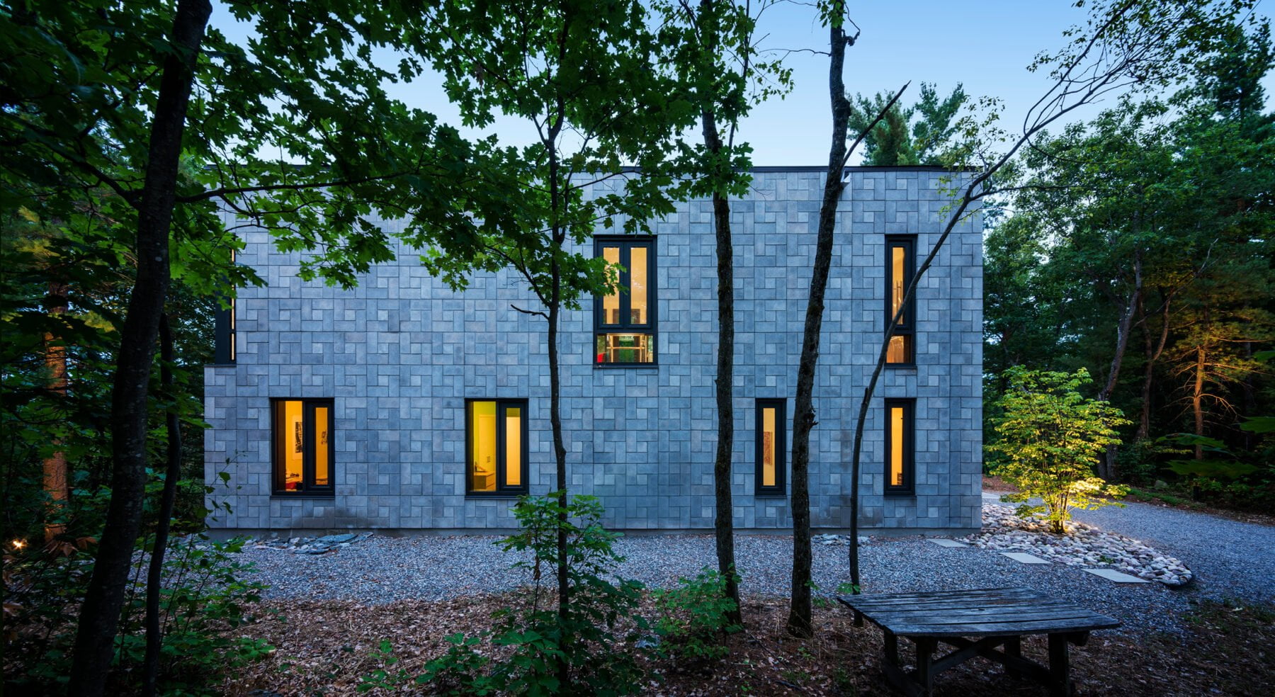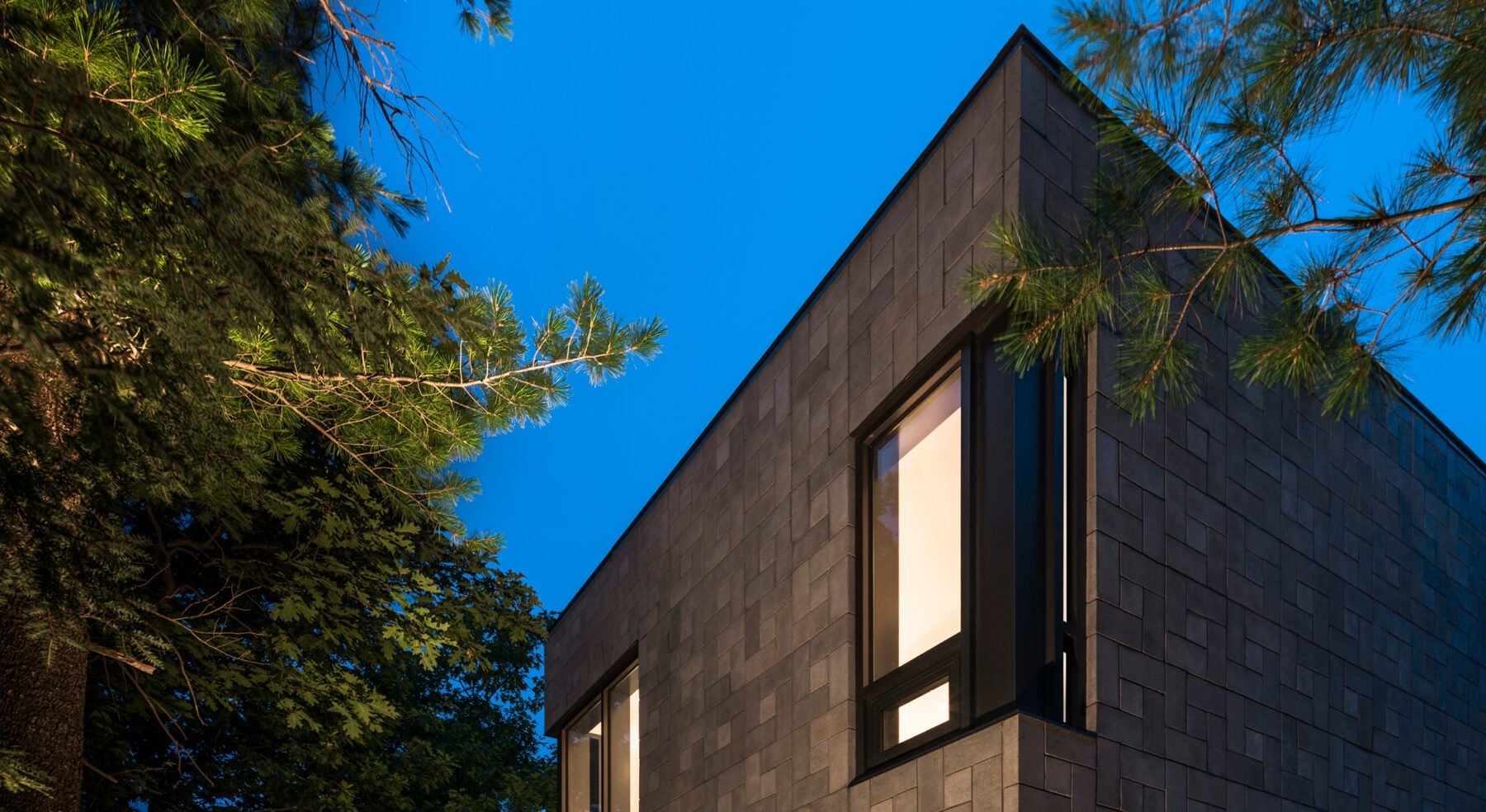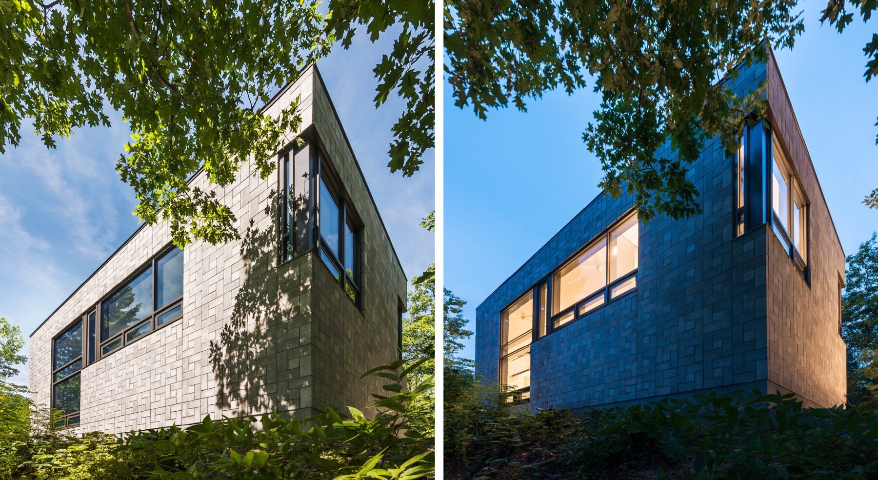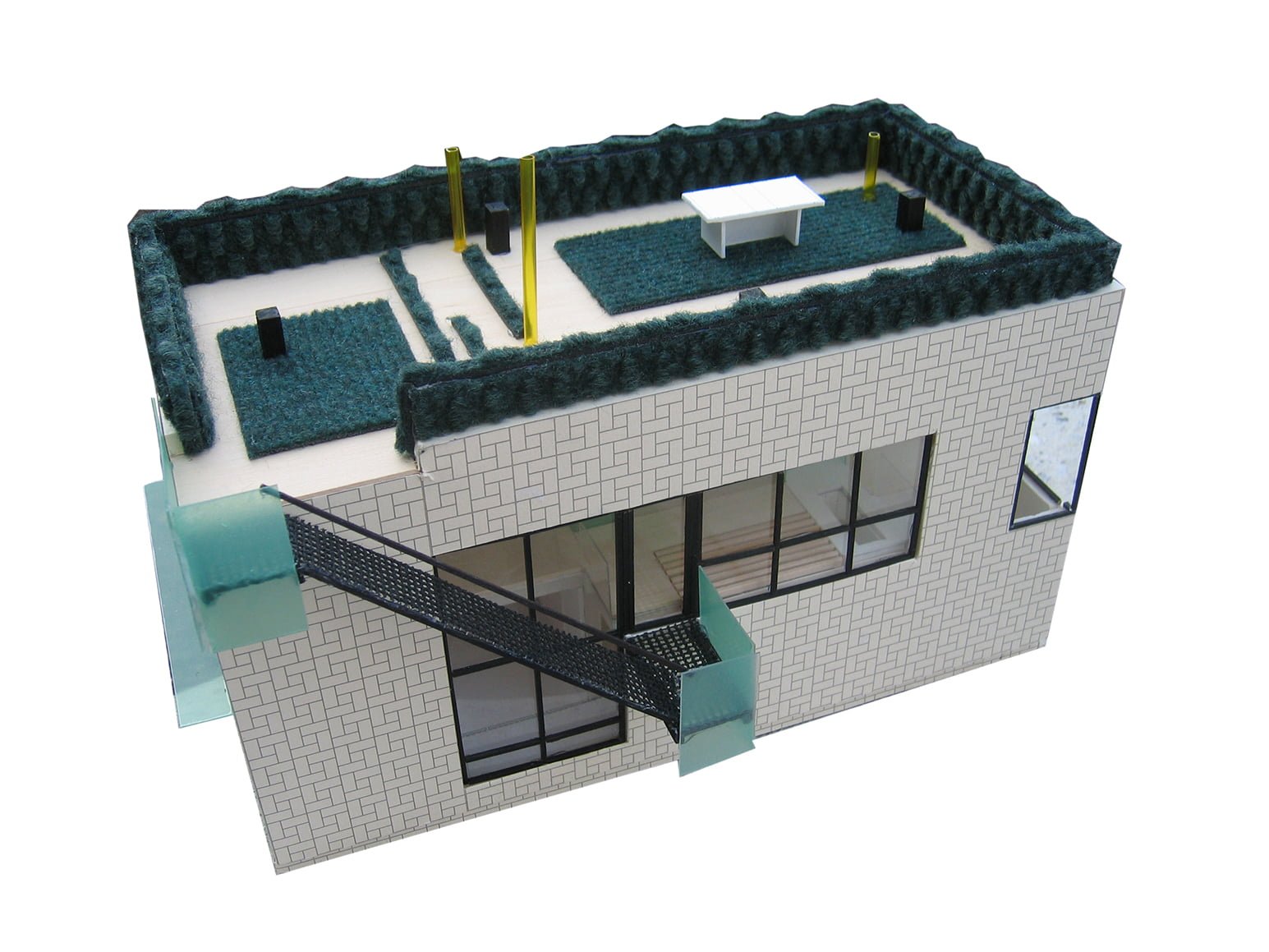 The lightness of the home’s interior is contrasted by the solidity of the exterior. In response to the project’s modest budget, industrial concrete blocks were used as the exterior veneer, but in an unconventional manner with the rough material arranged in a pinwheel pattern creating a playful façade. Lastly, because the house is small, an exterior, screened-in living/dining area was designed for the flat roof.