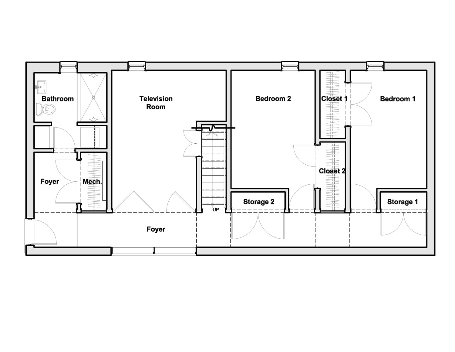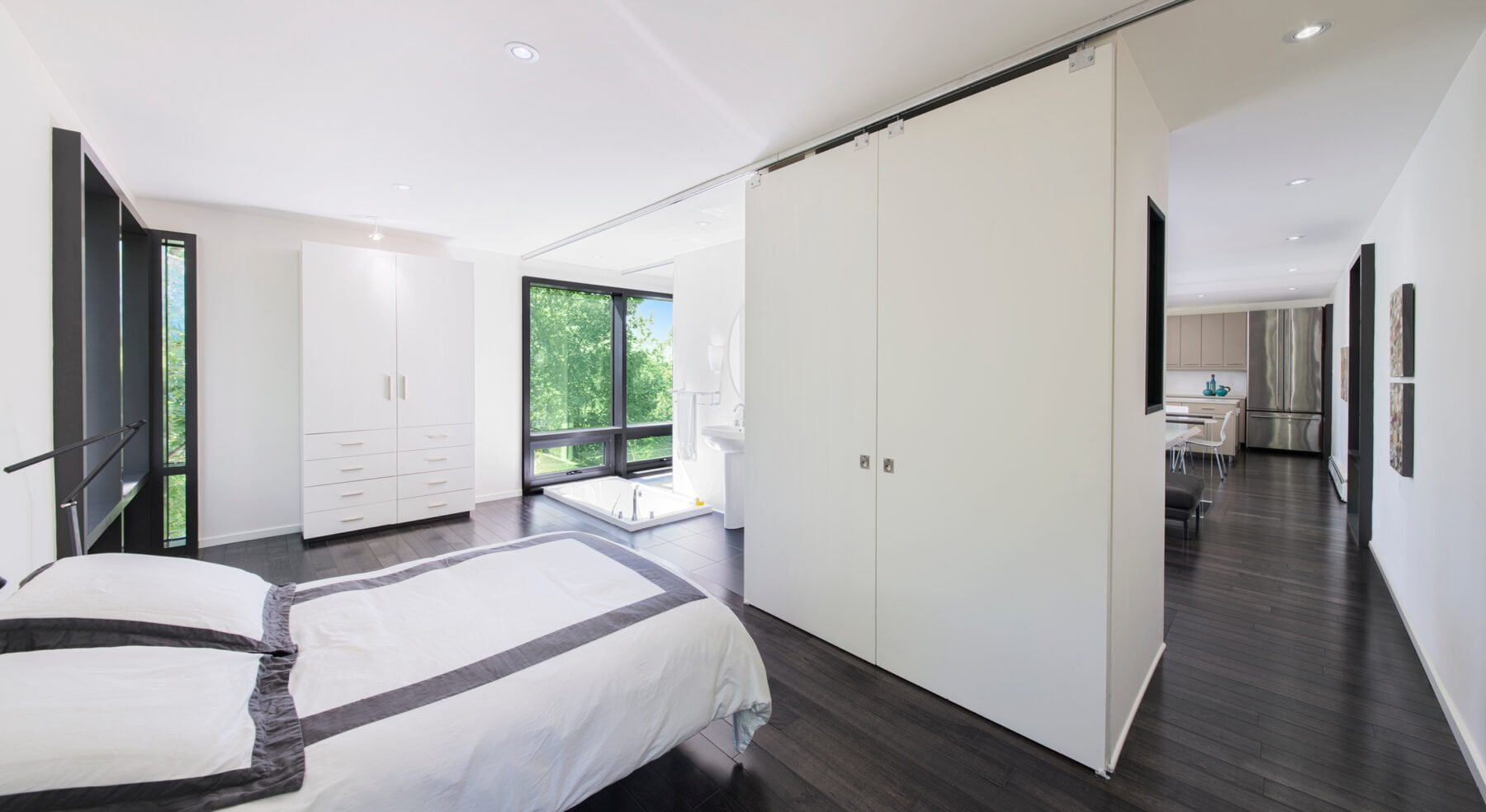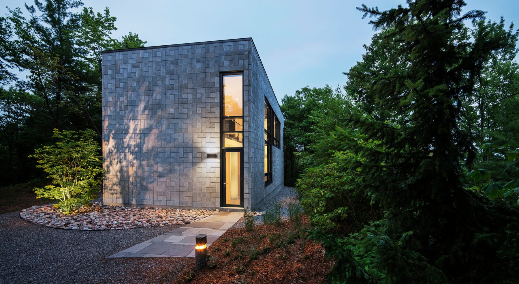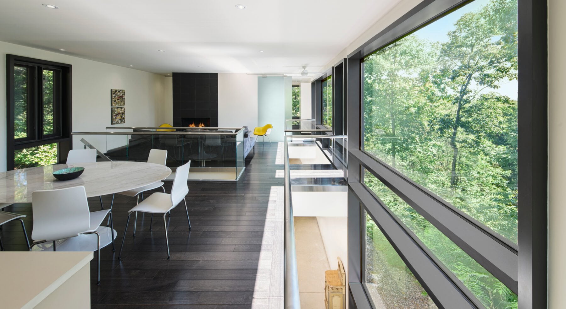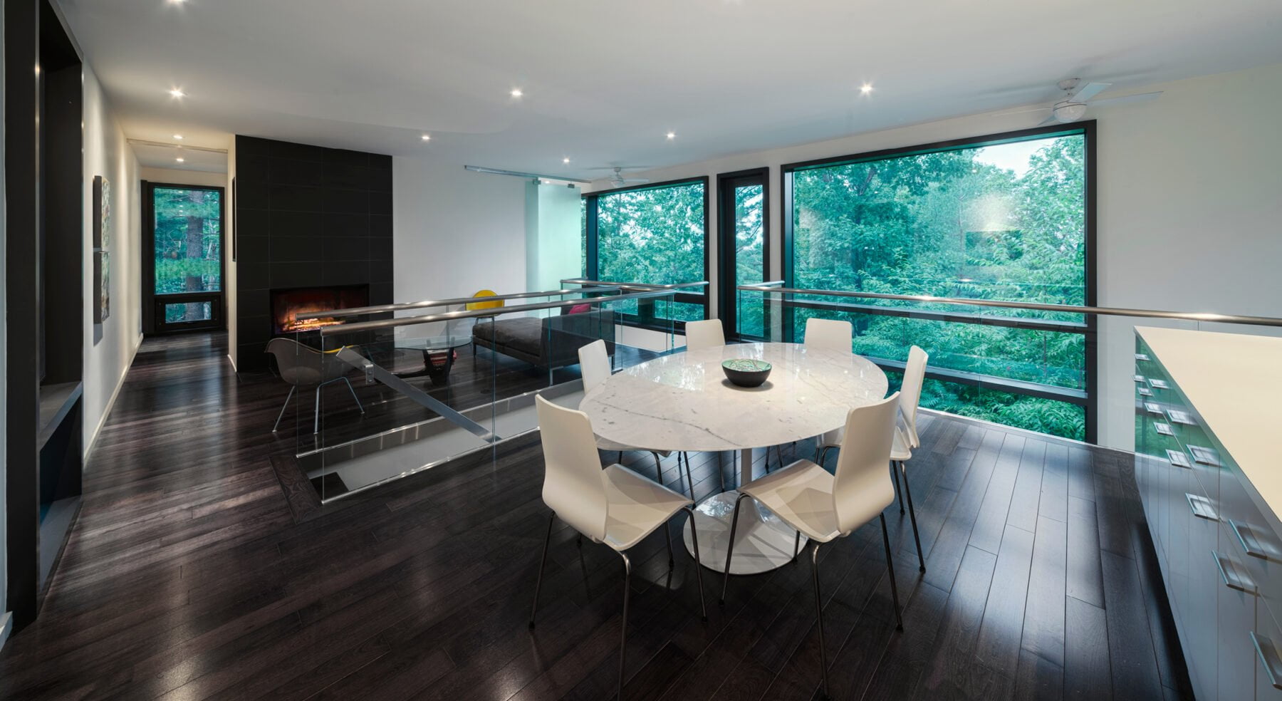 Overlooking a beautiful river valley, the house was conceived as a simple masonry volume with the ground floor being dedicated exclusively to the teenagers with bedrooms, TV area and sports equipment storage. The second storey features all of the common living spaces, as well as the master bedroom and bathroom. The 2 levels are joined by the double-height entryway and hallway below, creating the illusion of the primary living level floating above the serene vista beyond.