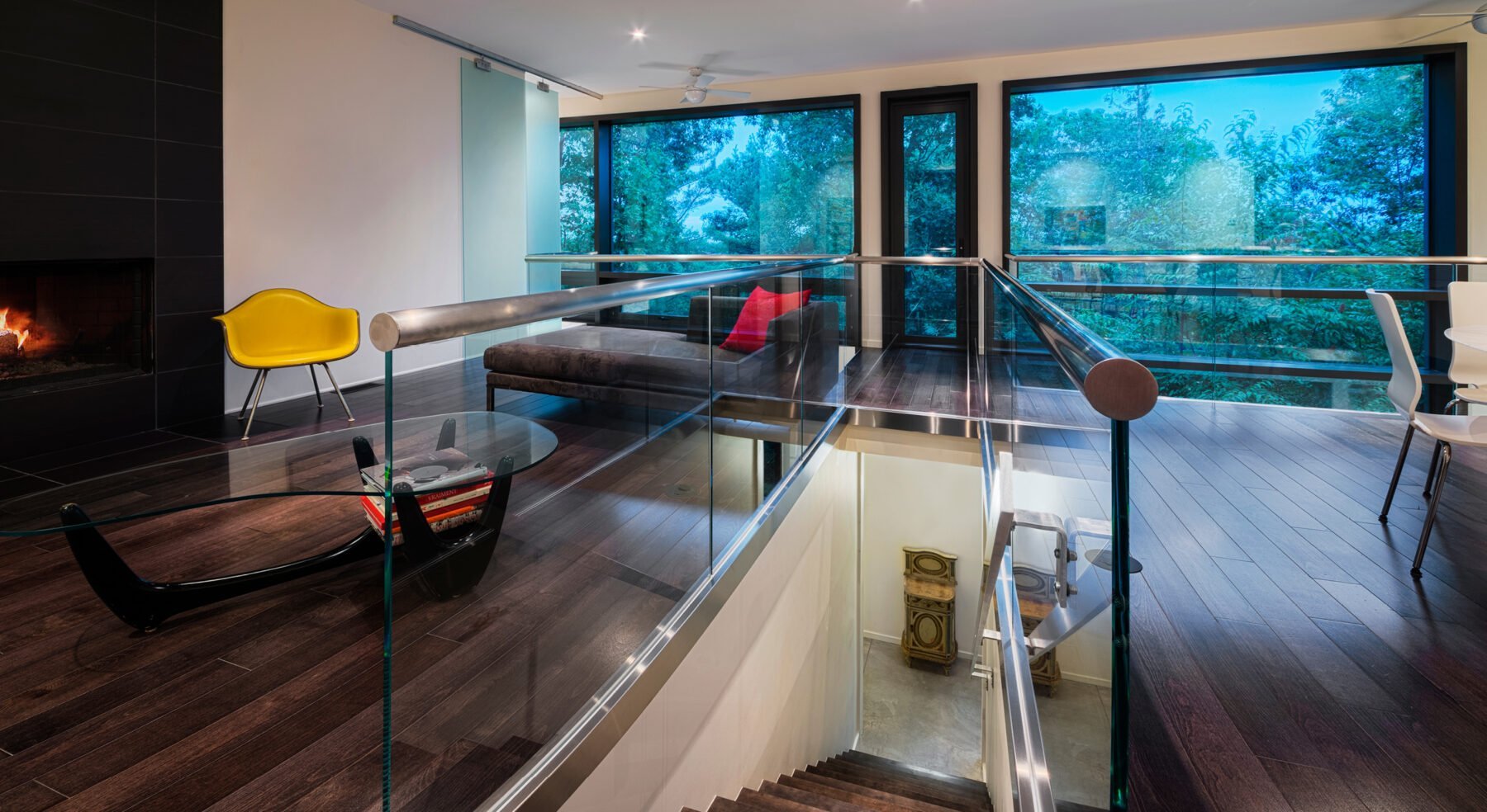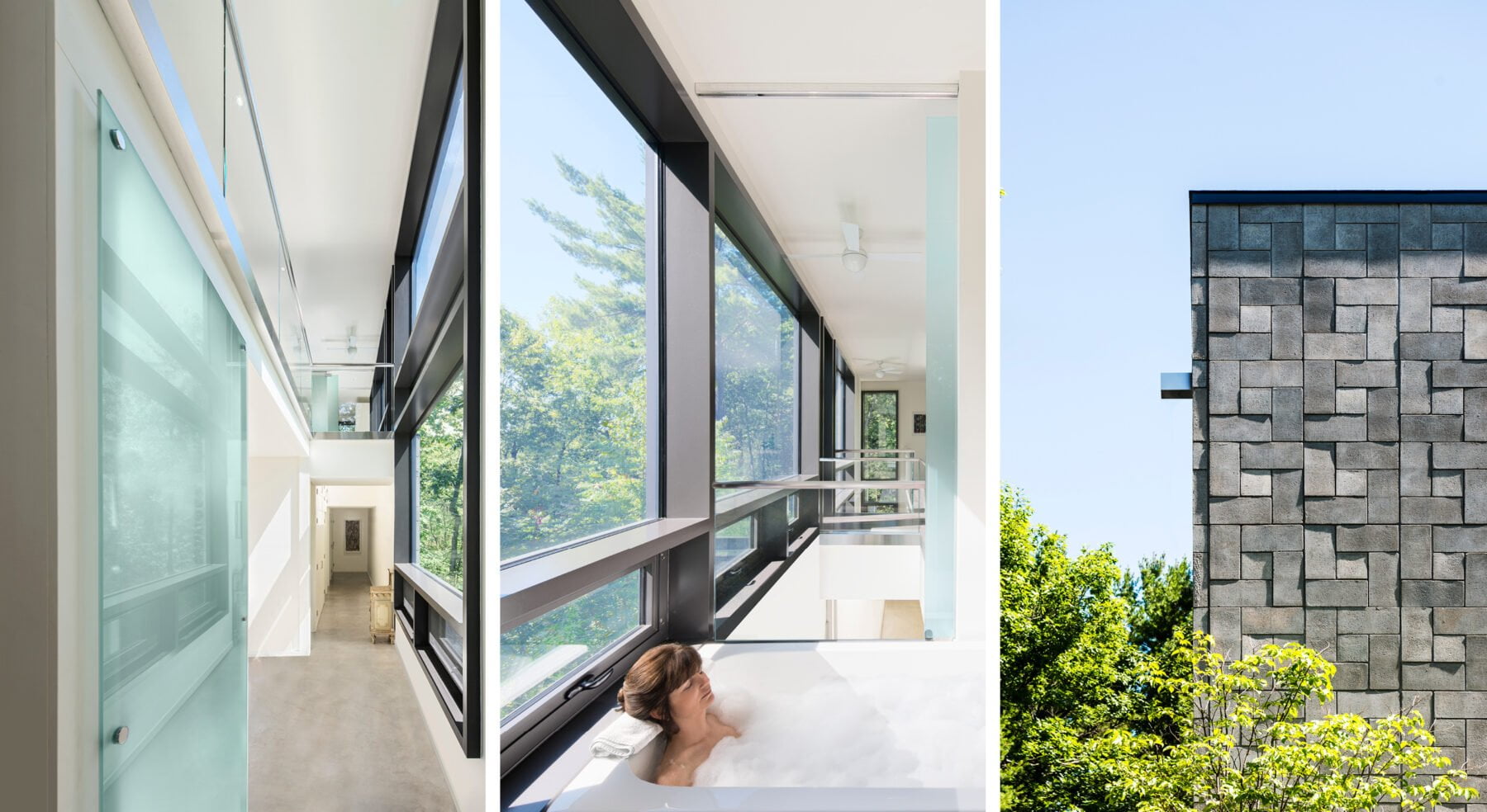 While the vast majority of building materials have an industrial feel, the look is countered with a sumptuous soaker tub suspended in the double-height space that overlooks the valley.