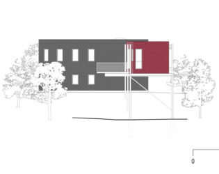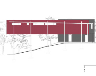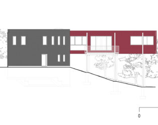 The DASH Home is a true forever home, designed to accommodate both the current lifestyle of a young family and the future needs of the parents as eventual seniors and empty nesters. The home is located in a traditional suburb where front porches, picture windows, and two-car garages are not so much features as they are values—symbols of happy domesticity and community. Our clients lived a few blocks away from their new address in a 1950s tract home, and while they sought a more accessible and more artful home, they cherished the iconic domestic spaces of middle-class suburbia. They had two specific requests: the new home needed to permit easy circulation within it even as they aged, and construction needed to preserve the mature trees on the site. The challenge to both requests was that the ground was steeply sloped, which meant that a single-level bungalow would require an extensive foundation, which in turn would destroy the trees.