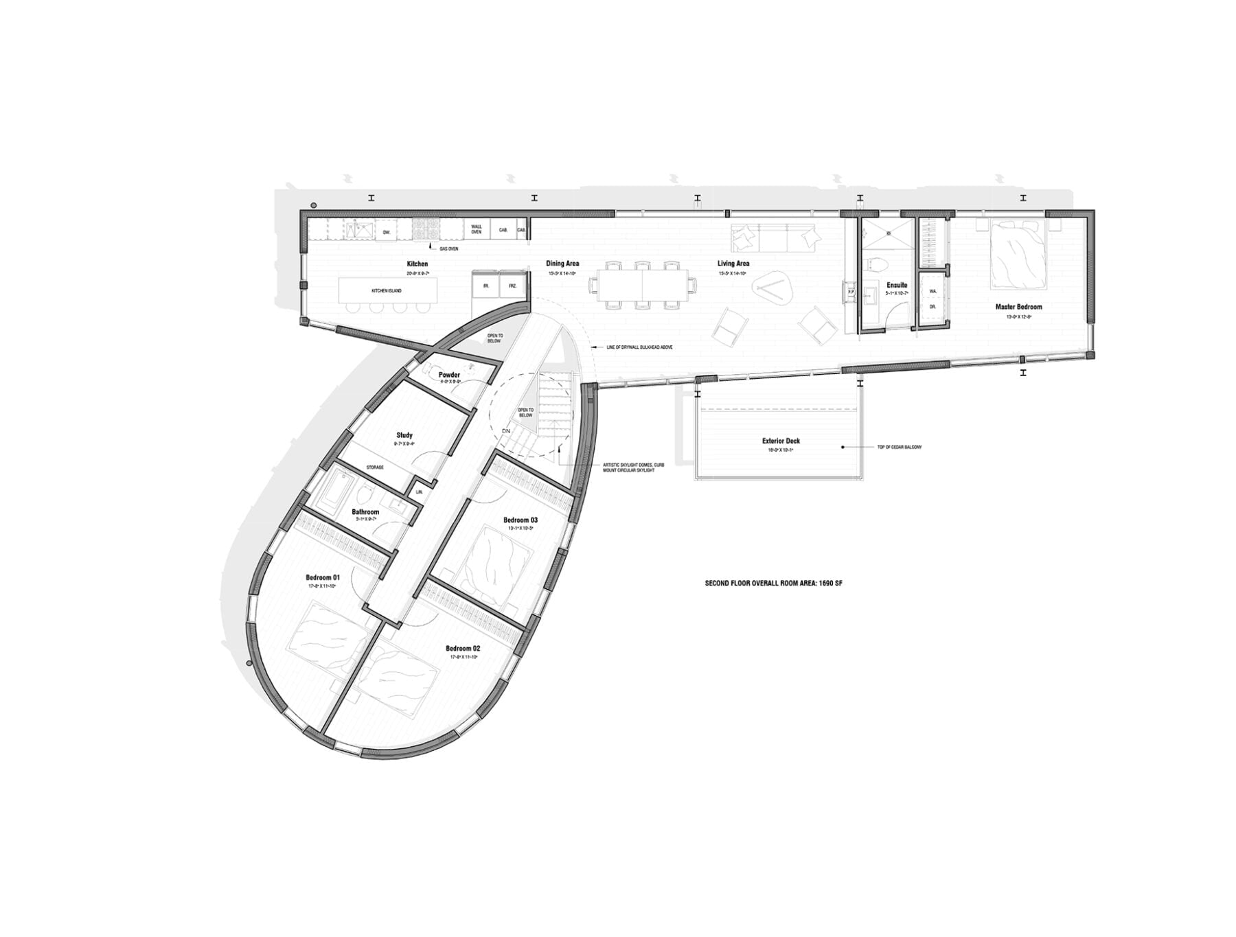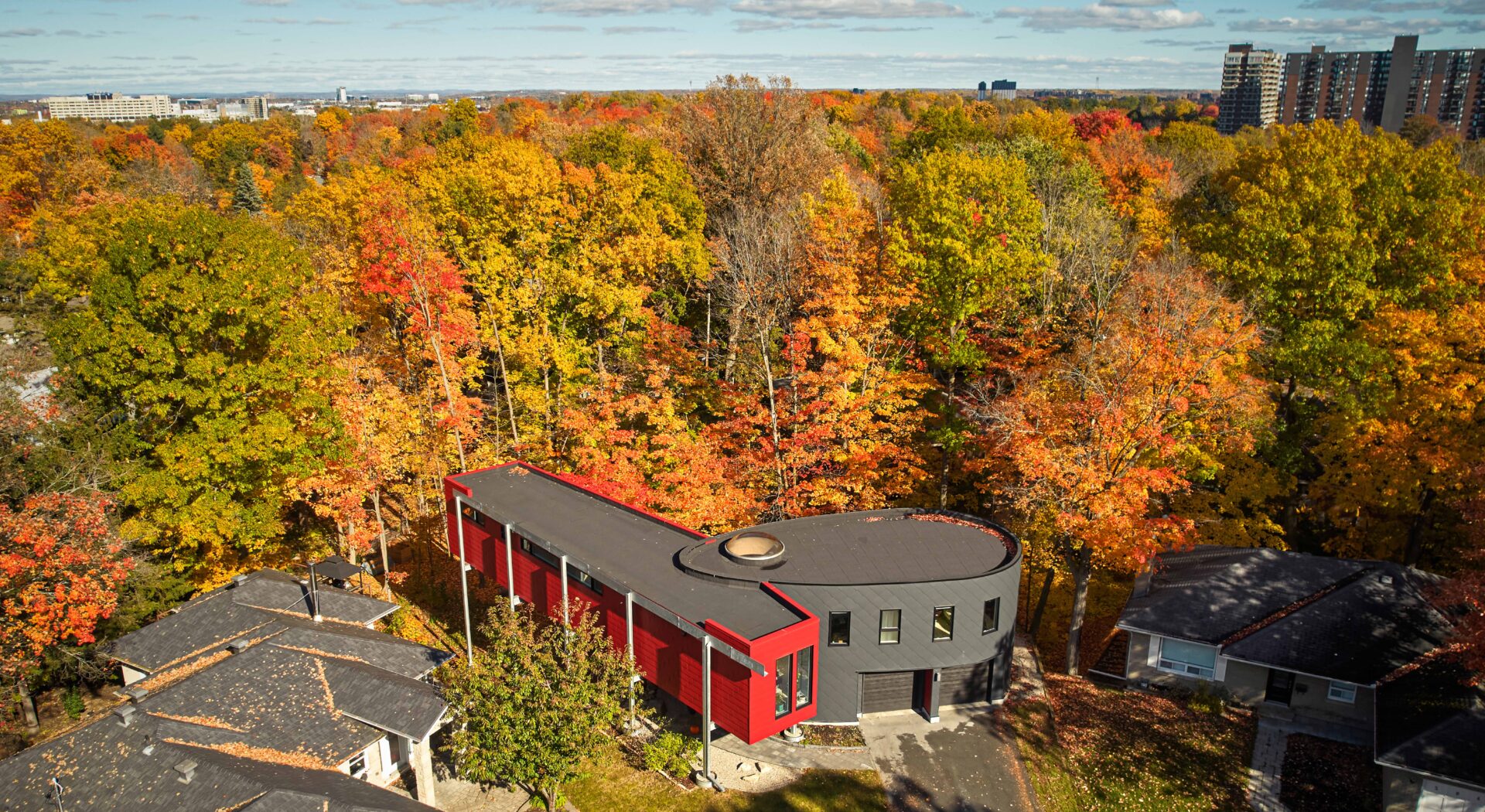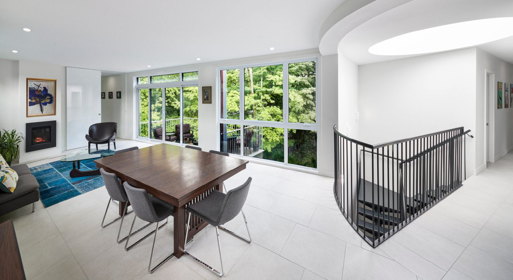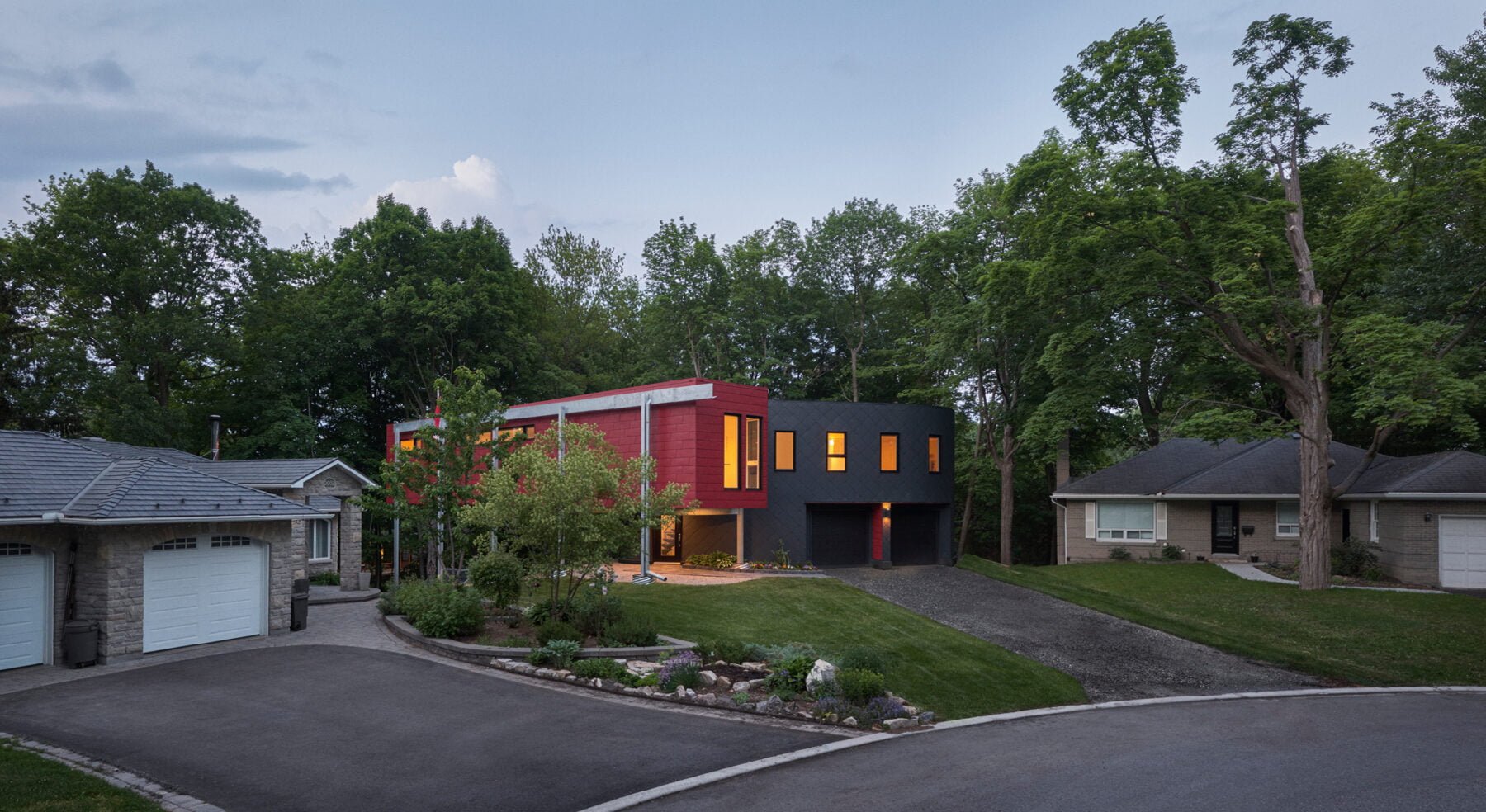 Being elevated, all the primary areas of the home have significant privacy even with nearby neighbours, and because the natural site is steeply sloped, the main living spaces are, in fact, in the treetops. There are two architectural volumes of the home: an oval that houses bedrooms and a study (the domain of teenagers), and a long rectangular volume that projects deep into and above the property, holding the kitchen, living/dining areas, and a master bedroom suite (i.e., the spaces of civilization). This cantilevered rectangular volume reinterprets the traditional entry porch, and its end becomes a picture window façade to the street below. All spaces are designed with cross ventilation to minimize reliance on air conditioning, and the selective distribution of clerestory windows and skylights provides significant interior daylight and views of the sky and treetops while ensuring privacy.