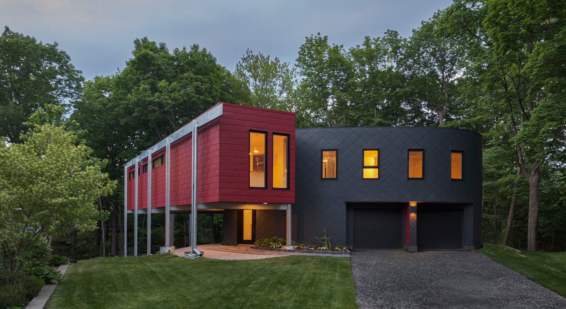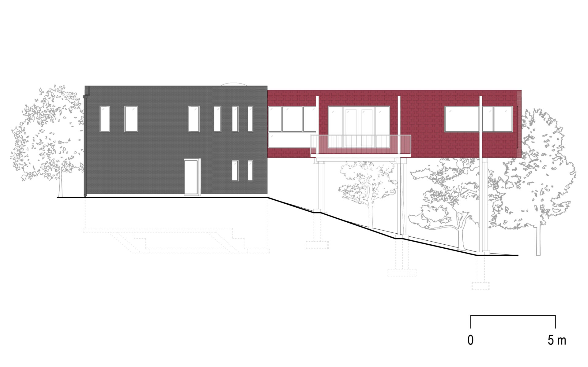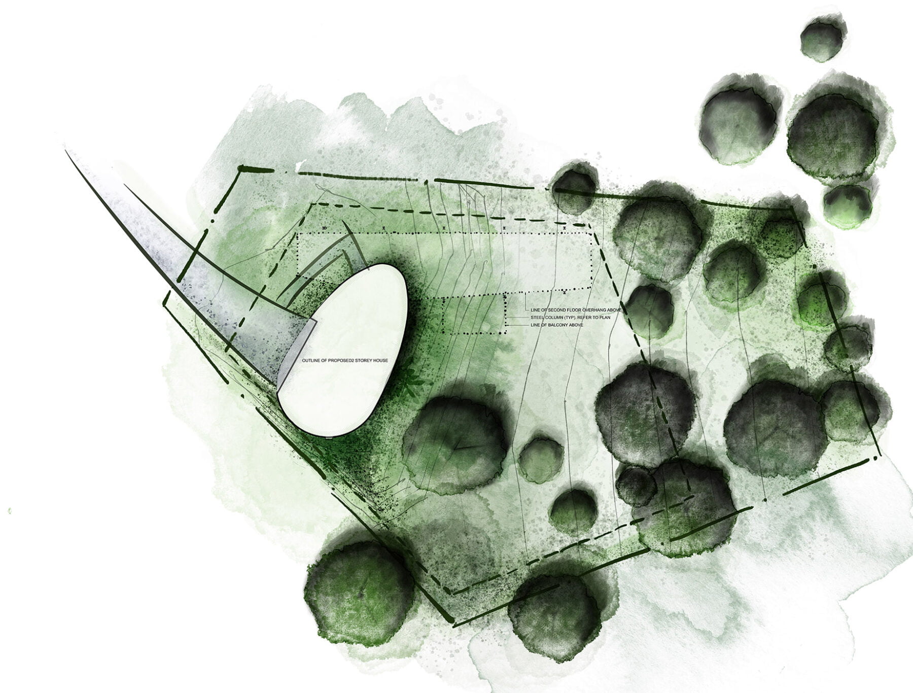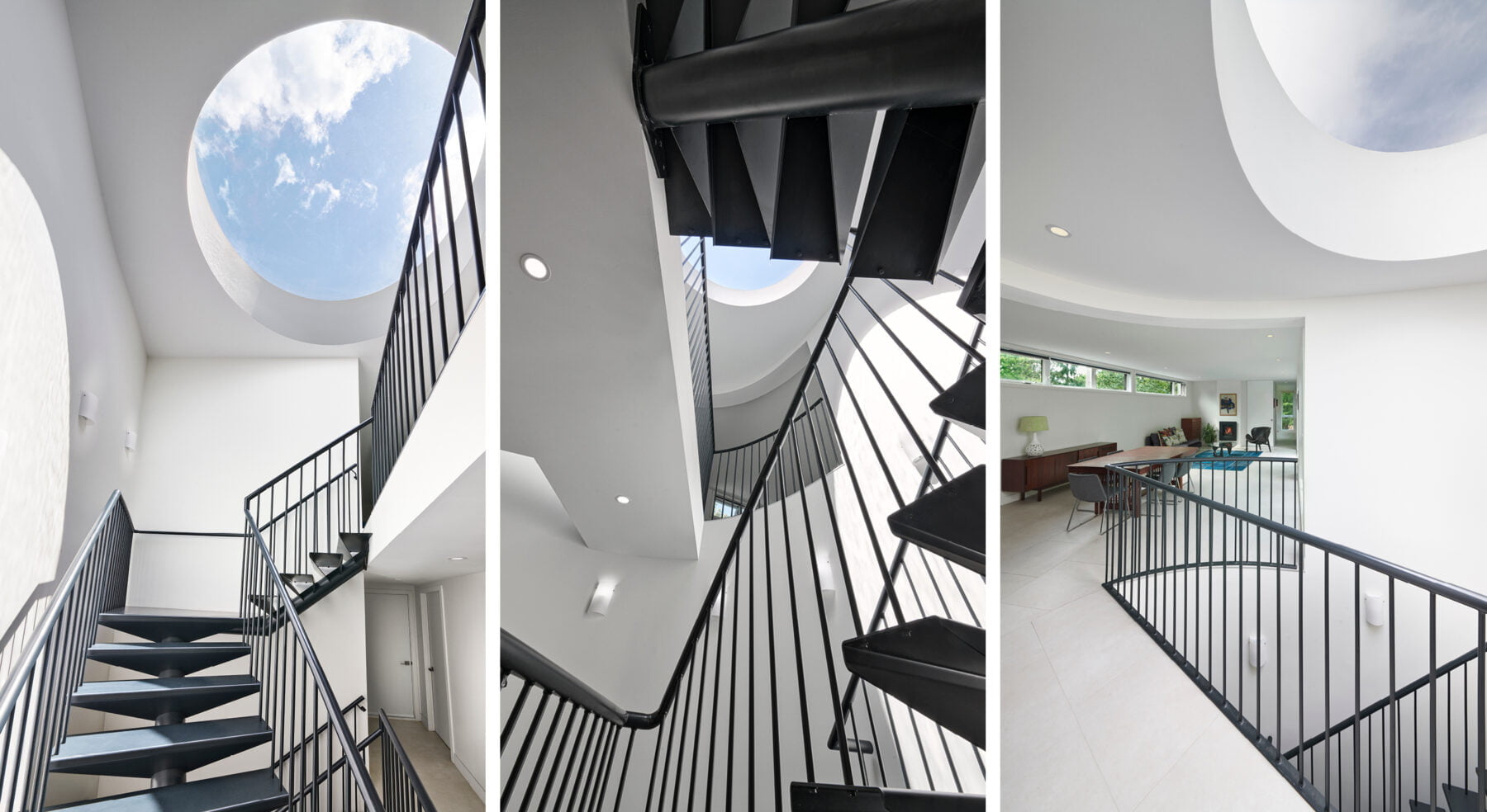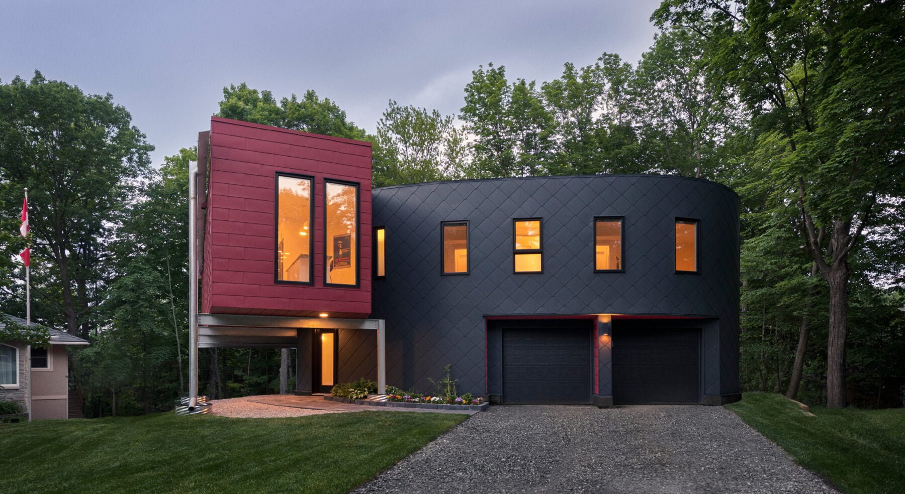 Being elevated, all the primary areas of the home have significant privacy even with nearby neighbours, and because the natural site is steeply sloped, the main living spaces are, in fact, in the treetops. There are two architectural volumes of the home: an oval that houses bedrooms and a study (the domain of teenagers), and a long rectangular volume that projects deep into and above the property, holding the kitchen, living/dining areas, and a master bedroom suite (i.e., the spaces of civilization). This cantilevered rectangular volume reinterprets the traditional entry porch, and its end becomes a picture window façade to the street below. All spaces are designed with cross ventilation to minimize reliance on air conditioning, and the selective distribution of clerestory windows and skylights provides significant interior daylight and views of the sky and treetops while ensuring privacy.