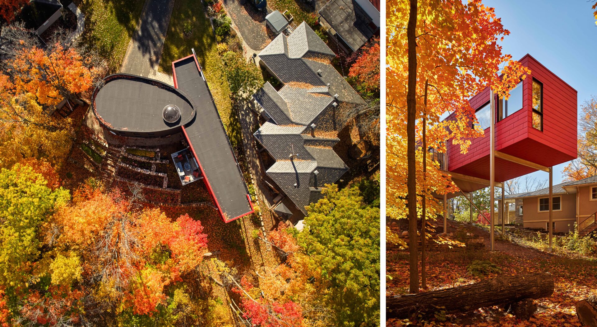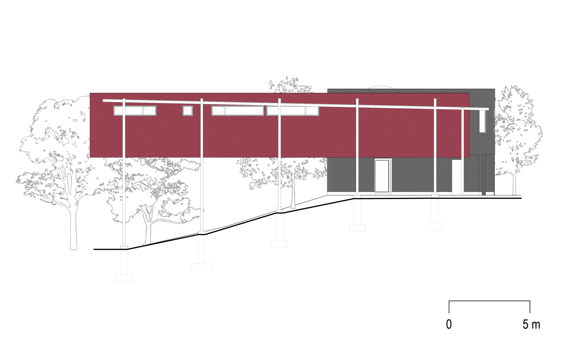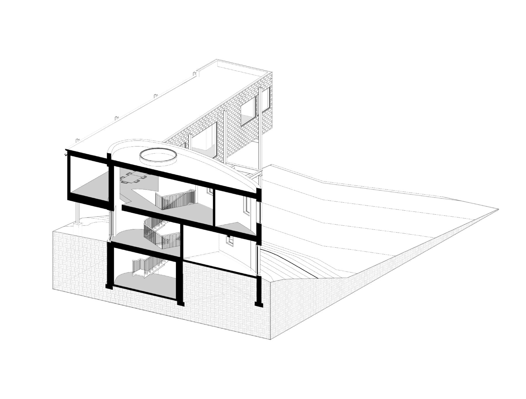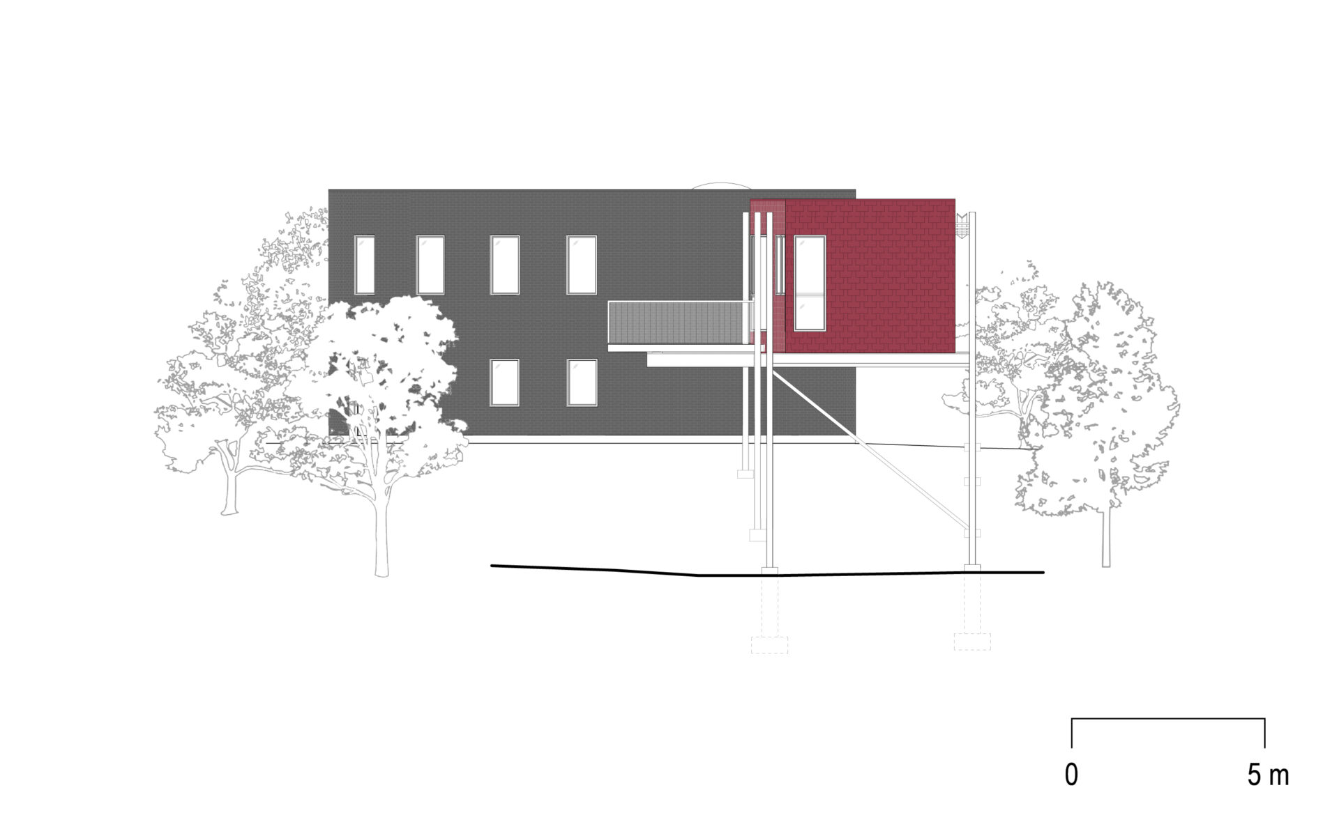 Being elevated, all the primary areas of the home have significant privacy even with nearby neighbours, and because the natural site is steeply sloped, the main living spaces are, in fact, in the treetops. There are two architectural volumes of the home: an oval that houses bedrooms and a study (the domain of teenagers), and a long rectangular volume that projects deep into and above the property, holding the kitchen, living/dining areas, and a master bedroom suite (i.e., the spaces of civilization). This cantilevered rectangular volume reinterprets the traditional entry porch, and its end becomes a picture window façade to the street below. All spaces are designed with cross ventilation to minimize reliance on air conditioning, and the selective distribution of clerestory windows and skylights provides significant interior daylight and views of the sky and treetops while ensuring privacy.
