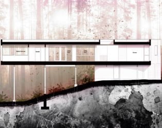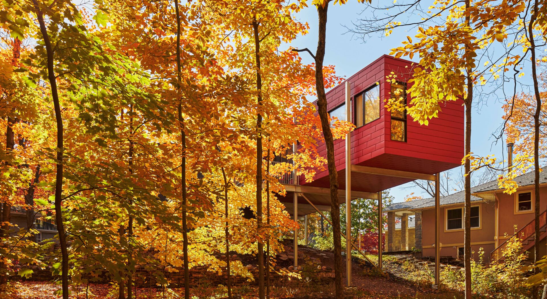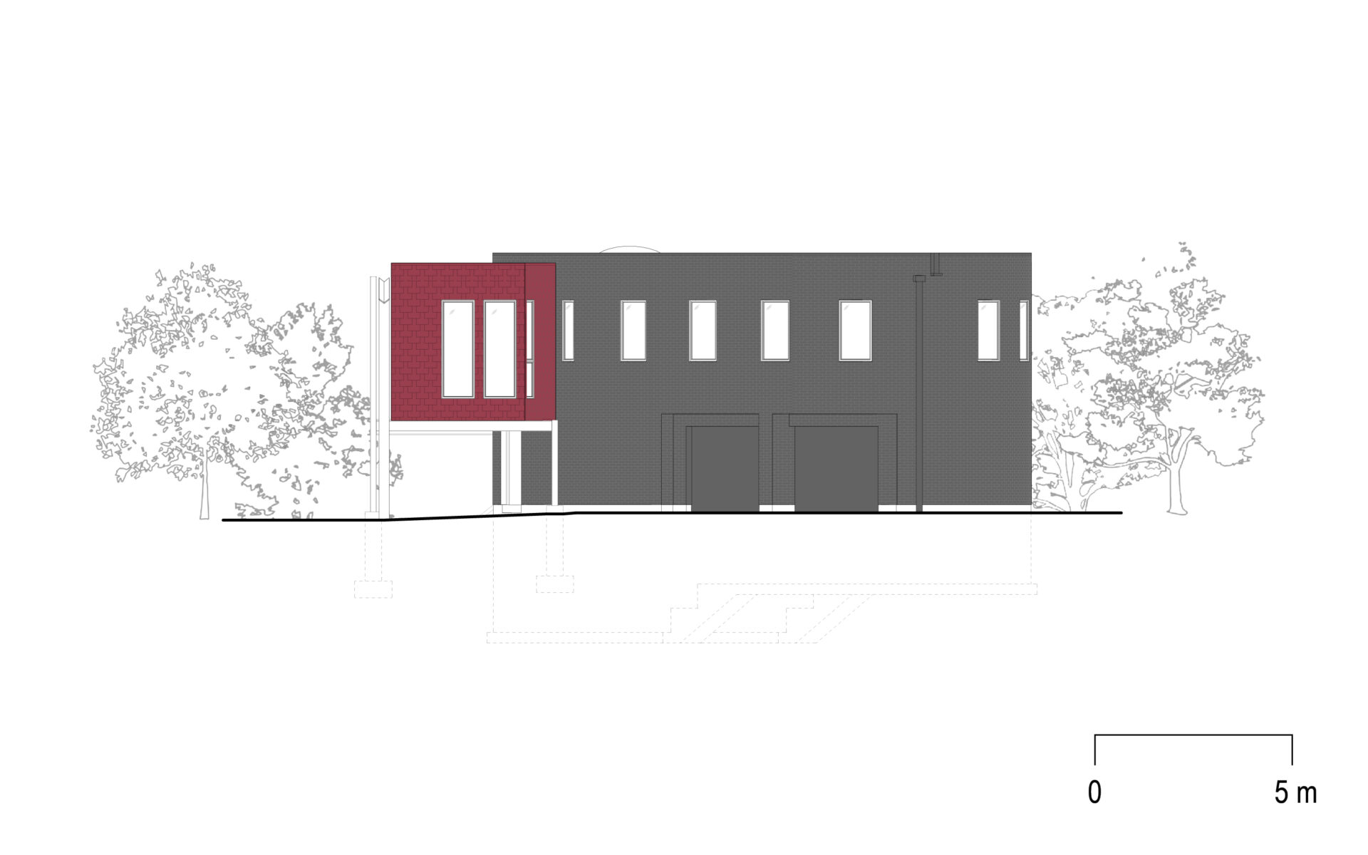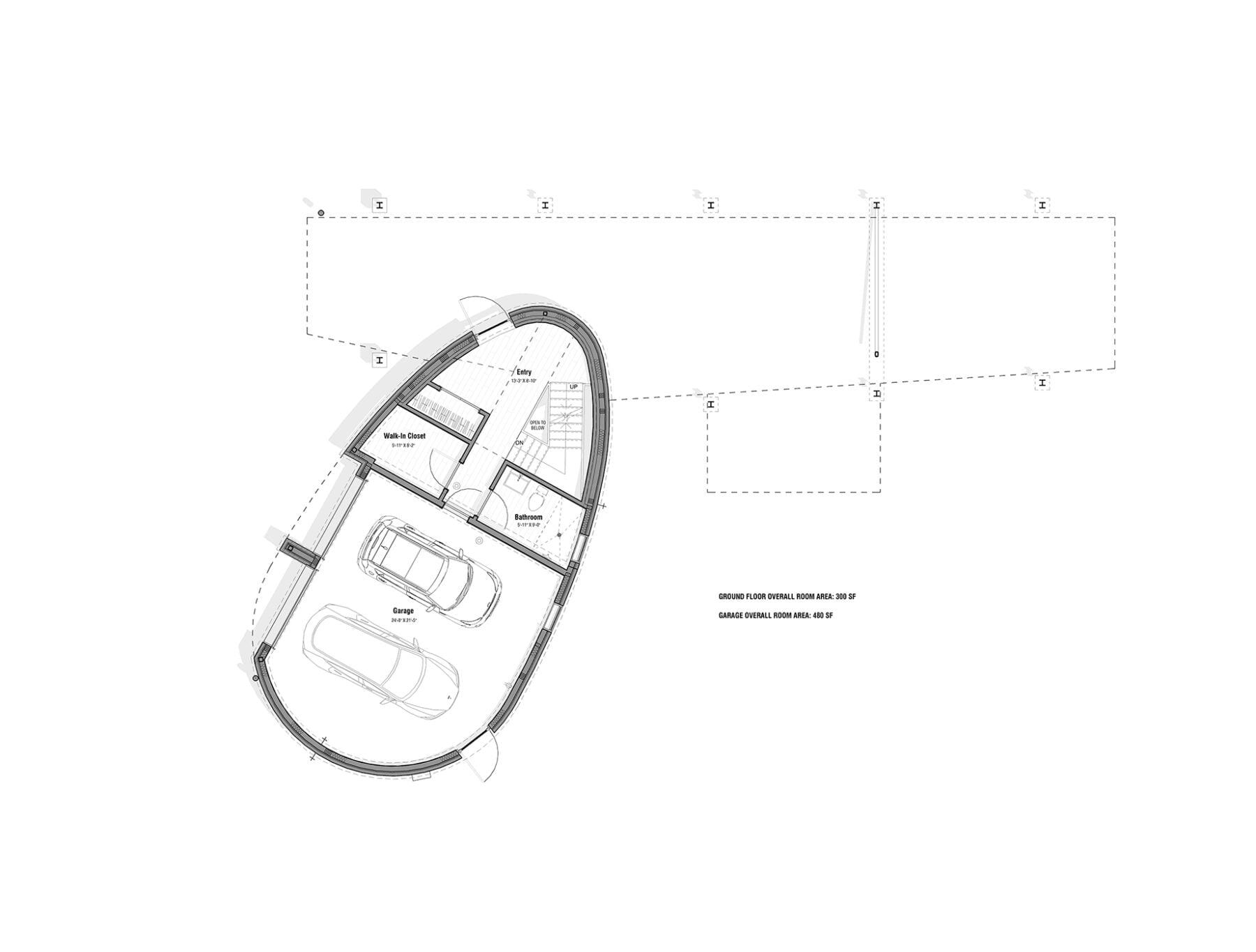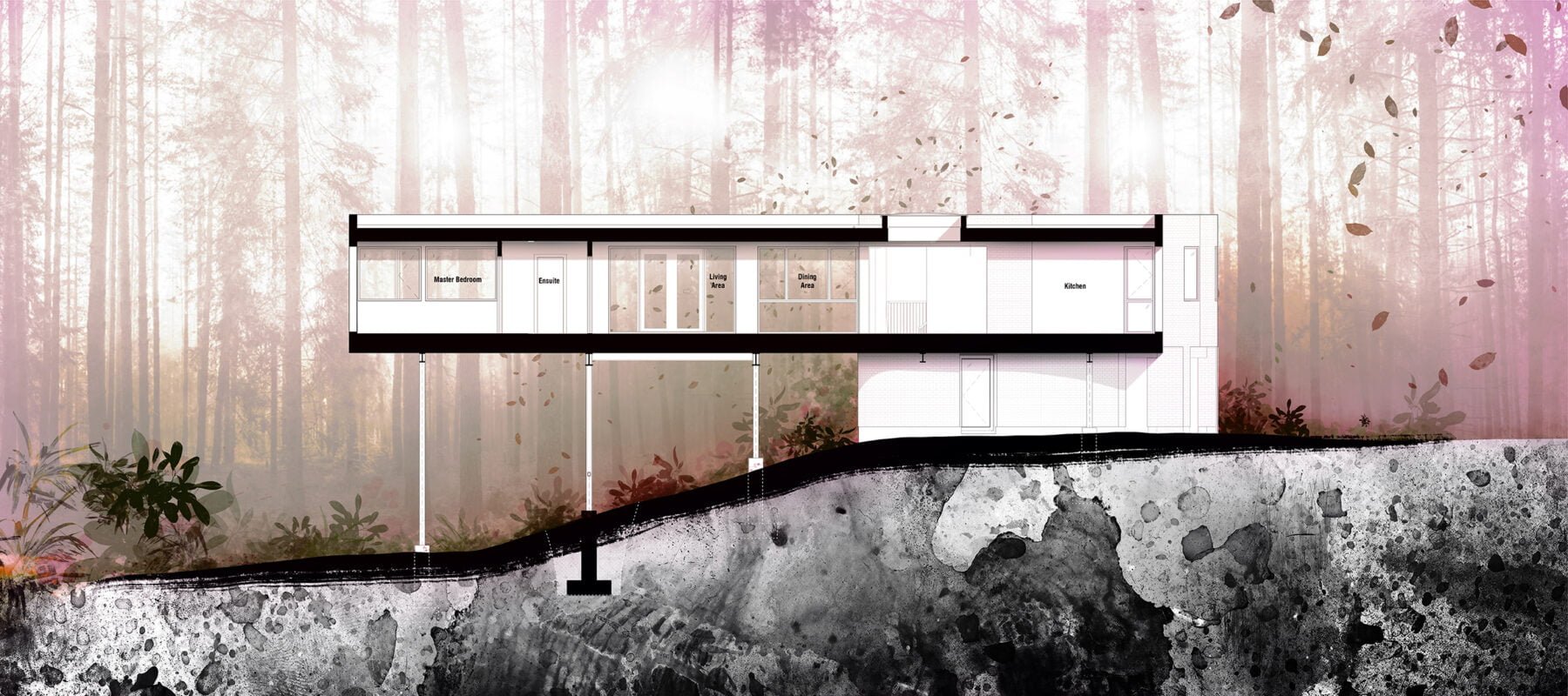 Being elevated, all the primary areas of the home have significant privacy even with nearby neighbours, and because the natural site is steeply sloped, the main living spaces are, in fact, in the treetops. There are two architectural volumes of the home: an oval that houses bedrooms and a study (the domain of teenagers), and a long rectangular volume that projects deep into and above the property, holding the kitchen, living/dining areas, and a master bedroom suite (i.e., the spaces of civilization). This cantilevered rectangular volume reinterprets the traditional entry porch, and its end becomes a picture window façade to the street below. All spaces are designed with cross ventilation to minimize reliance on air conditioning, and the selective distribution of clerestory windows and skylights provides significant interior daylight and views of the sky and treetops while ensuring privacy.