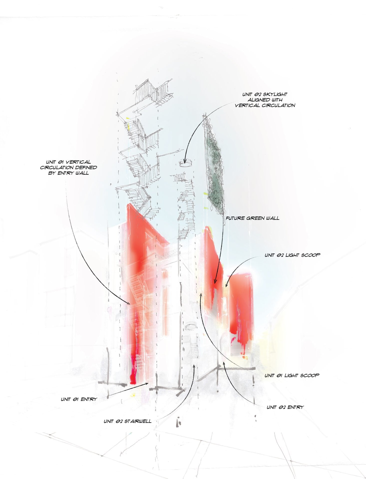 While the project’s budget didn’t allow for the most energy-efficient heating and mechanical systems, passive cooling is used in both units. The continuous vertical cuts within each home, holding the open stairs, operate as heat chimneys to draw fresh cool air in from below and warm air out through the roof-level doors and skylights. This reduces or eliminates the need for air conditioning.