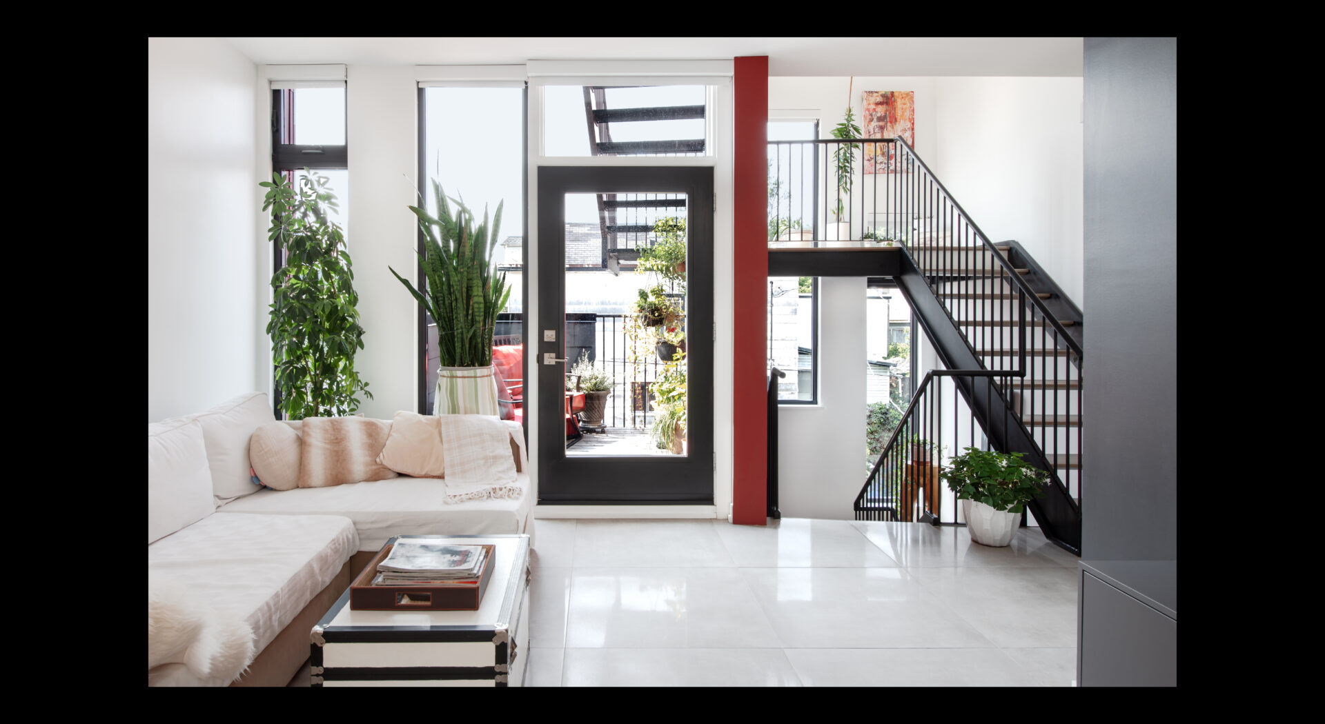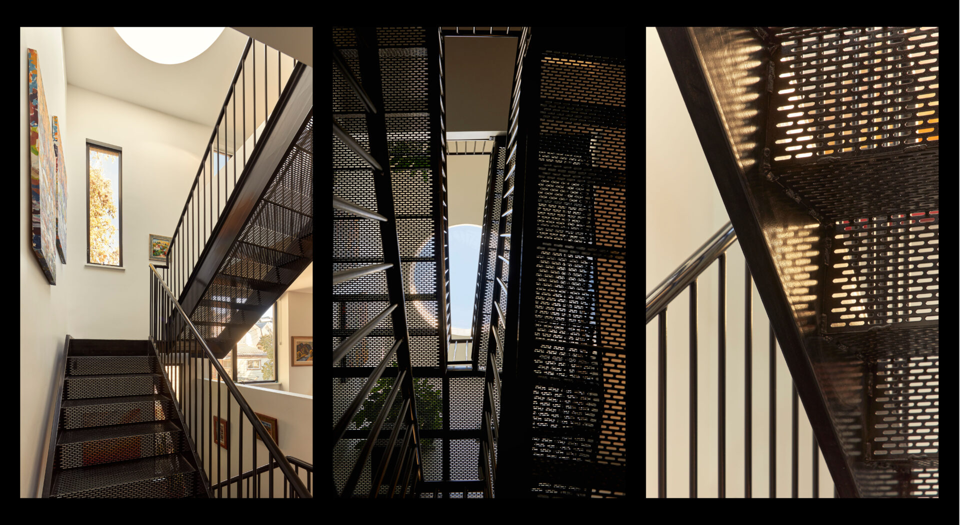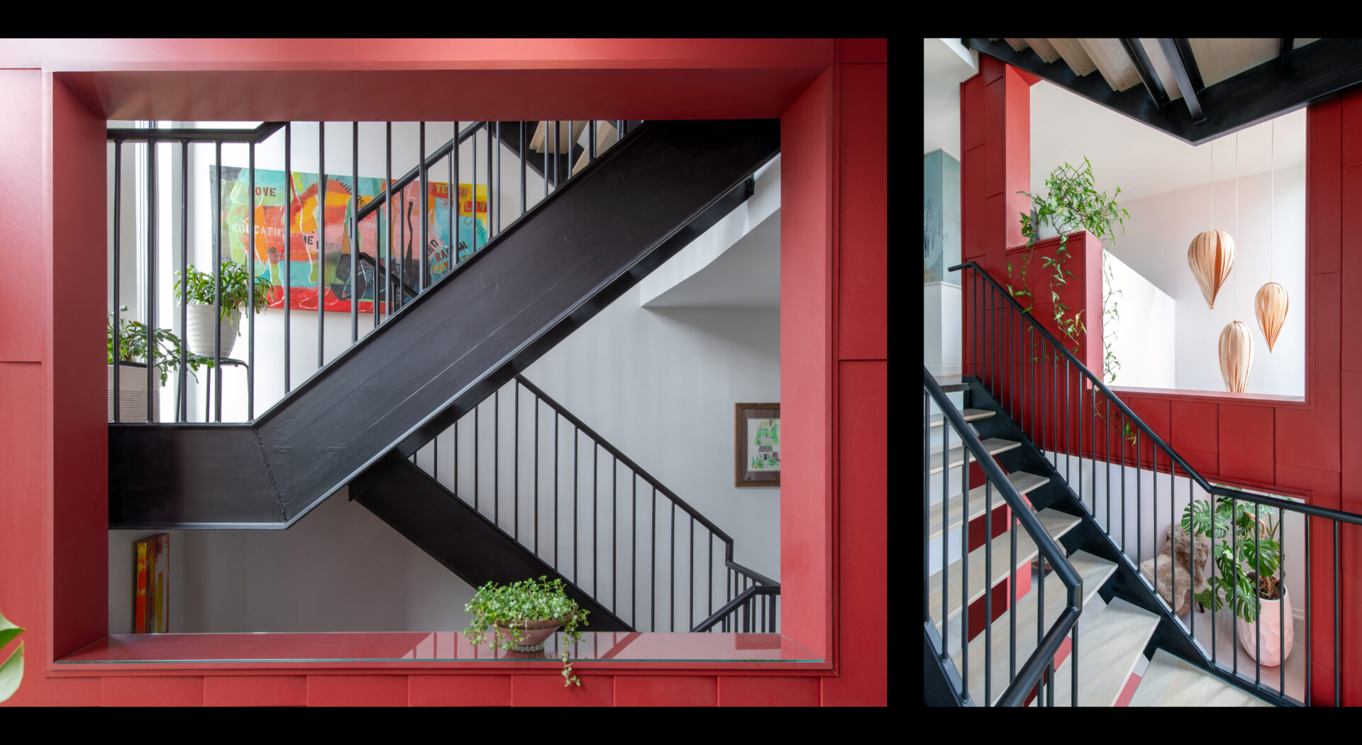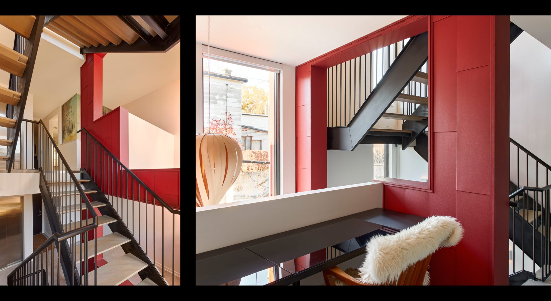 One sister sought abundant light-filled spaces where she could entertain friends. That home faces the street, soaking in western light, and has an entryway that is framed by a sculptural stair wall clad with the same red steel as the exterior. This gesture of “welcome” draws guests upwards to the public living area on the top floor where it then flows out to a balcony and invites guests to the roof garden.