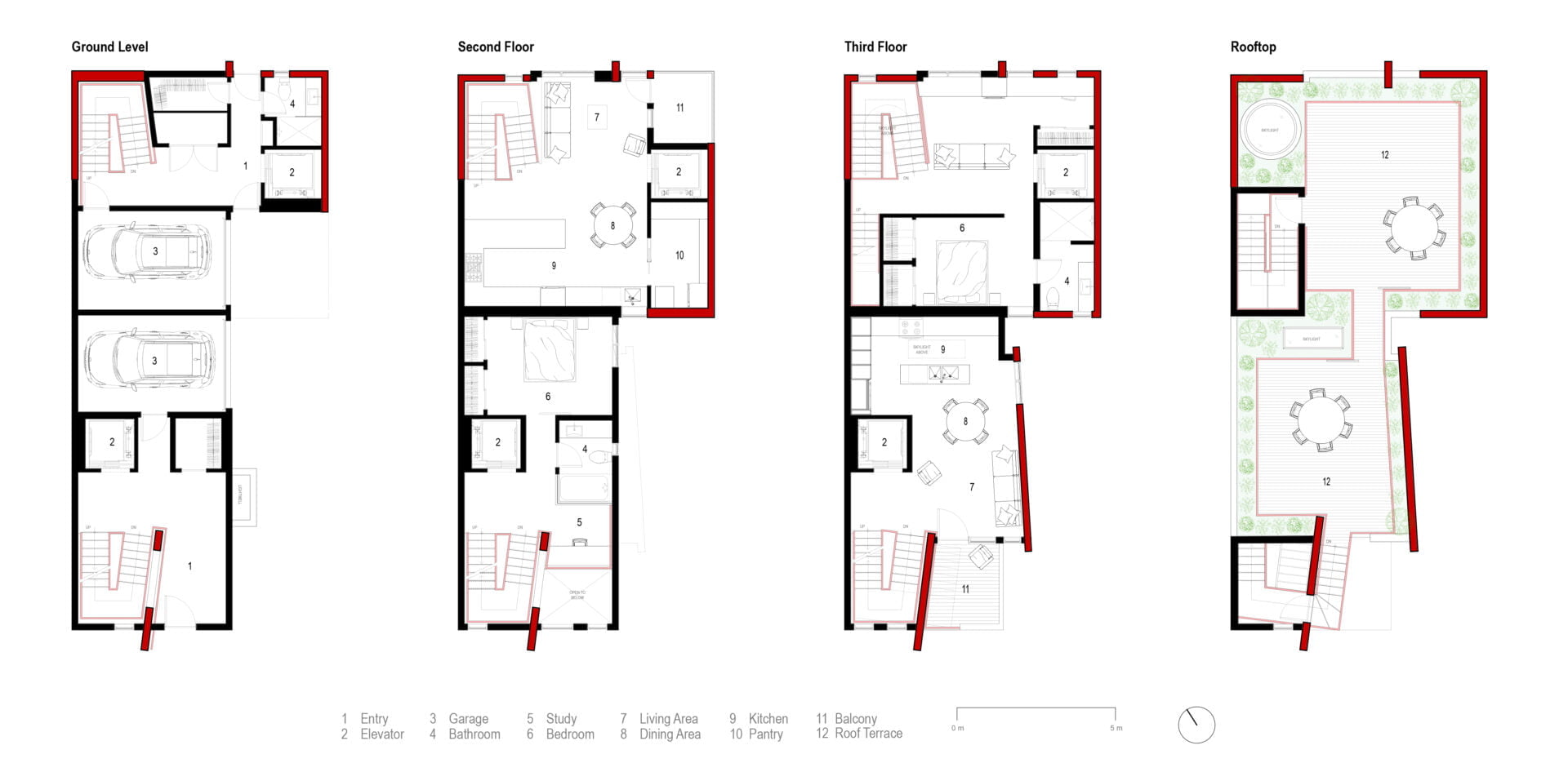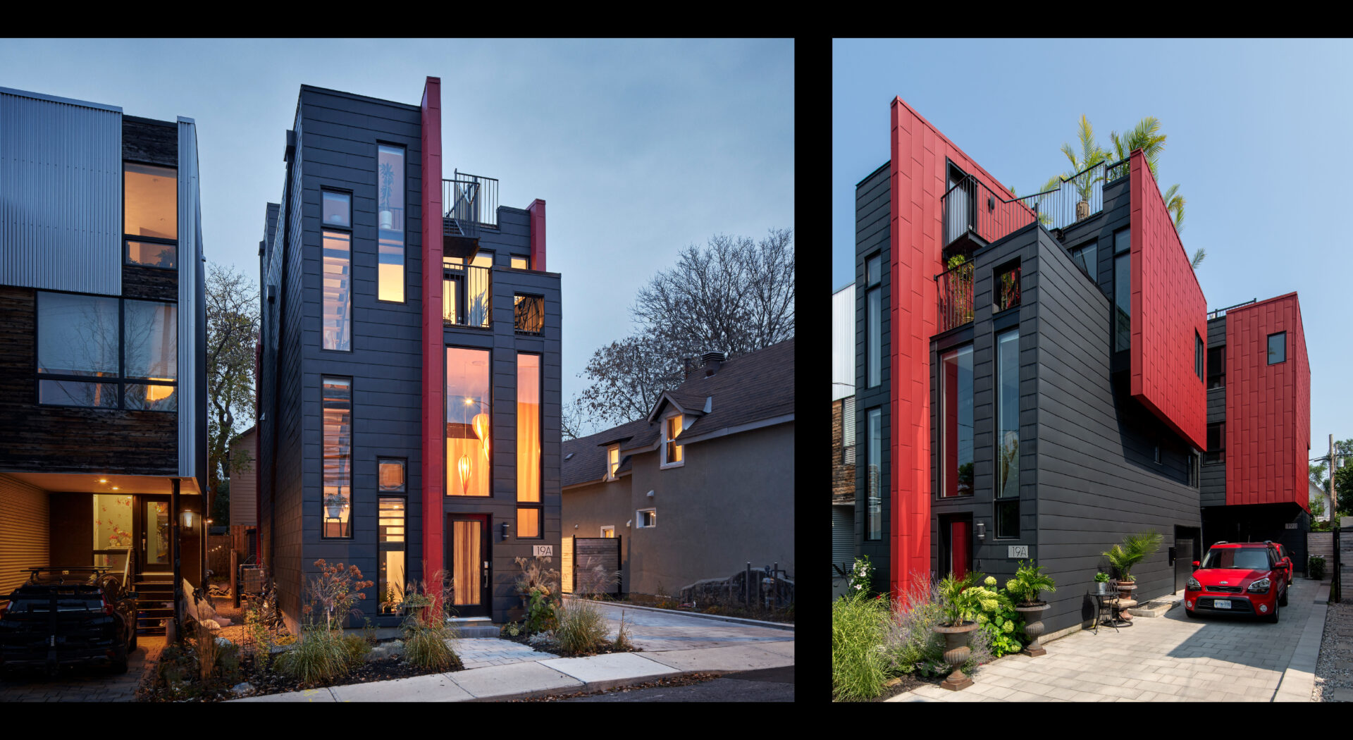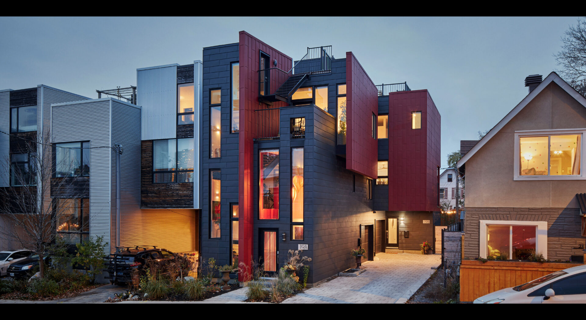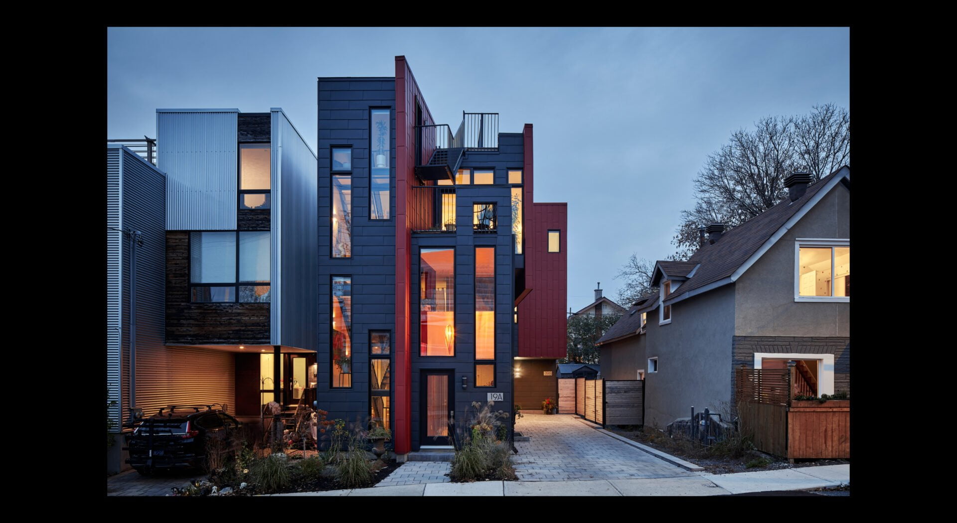 One sister sought abundant light-filled spaces where she could entertain friends. That home faces the street, soaking in western light, and has an entryway that is framed by a sculptural stair wall clad with the same red steel as the exterior. This gesture of “welcome” draws guests upwards to the public living area on the top floor where it then flows out to a balcony and invites guests to the roof garden.