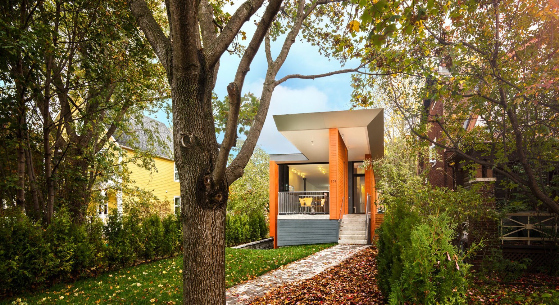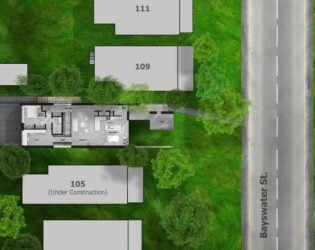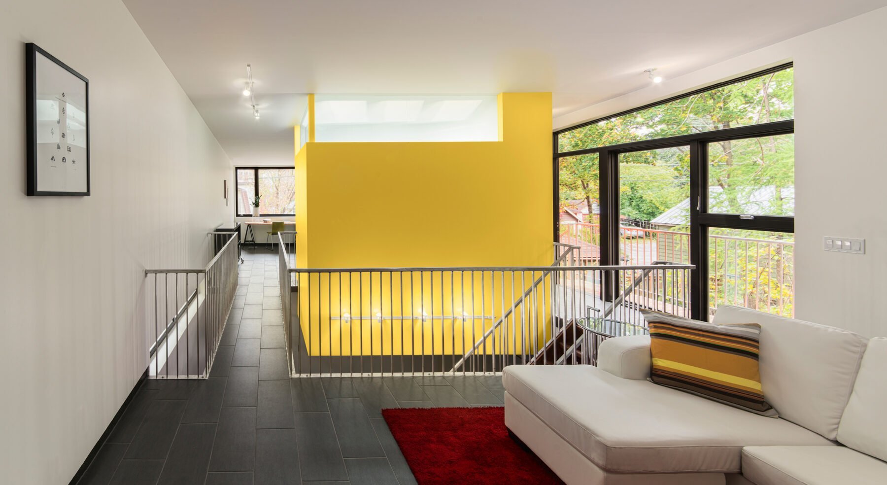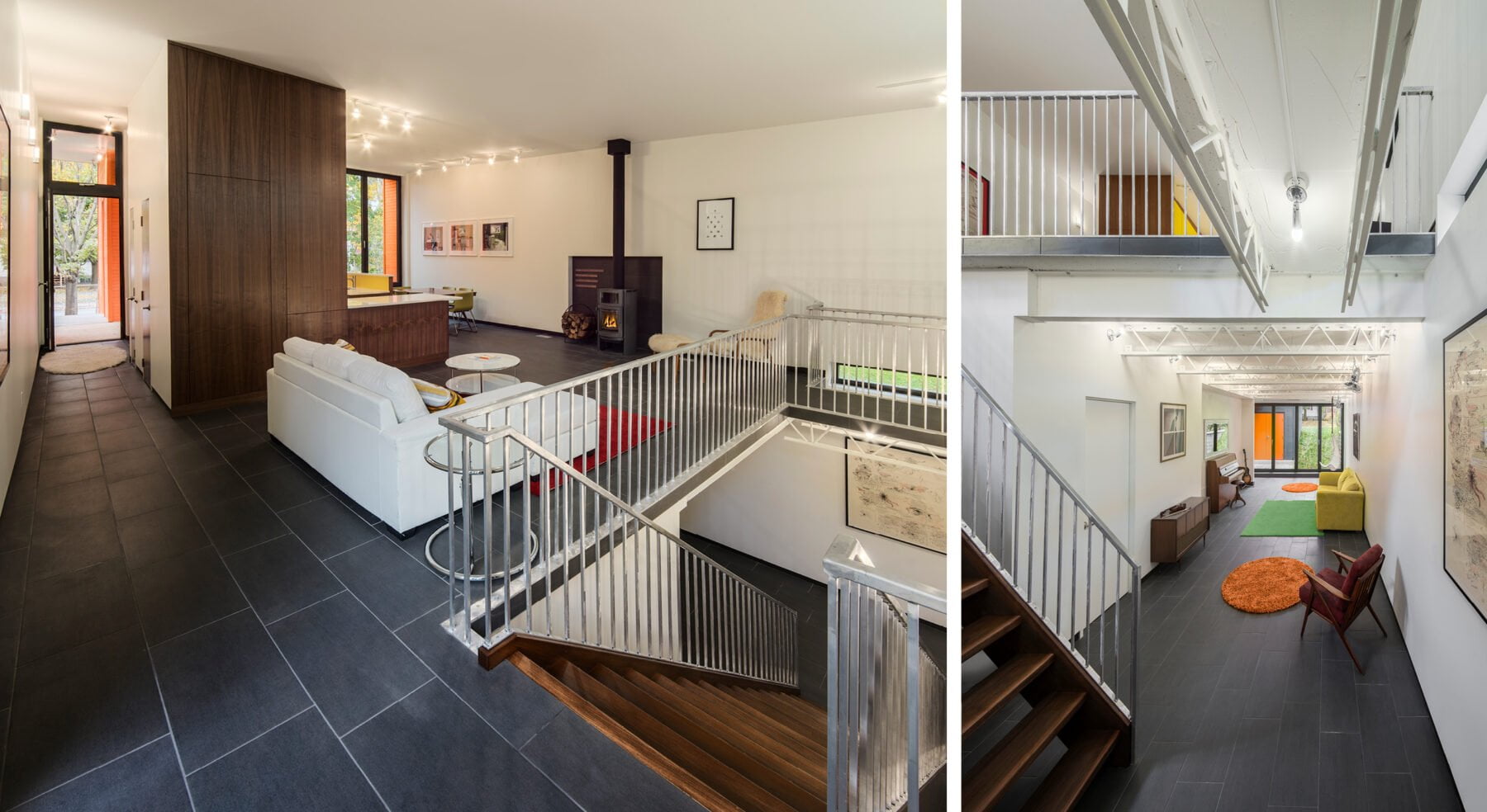 Light is brought into the centre of the home through an ensuite bathroom that features a large opening in the floor plate. Fitted with expansive skylights and clerestory, light pours through the opening, illuminating both levels. In such a narrow space that doesn’t allow for side windows, one might think this home would end up rather dark inside. But with some clever and somewhat unconventional design approaches, the Stacey-Turley Residence is bursting with light and has proven to be an eminently livable space for decades to come.
