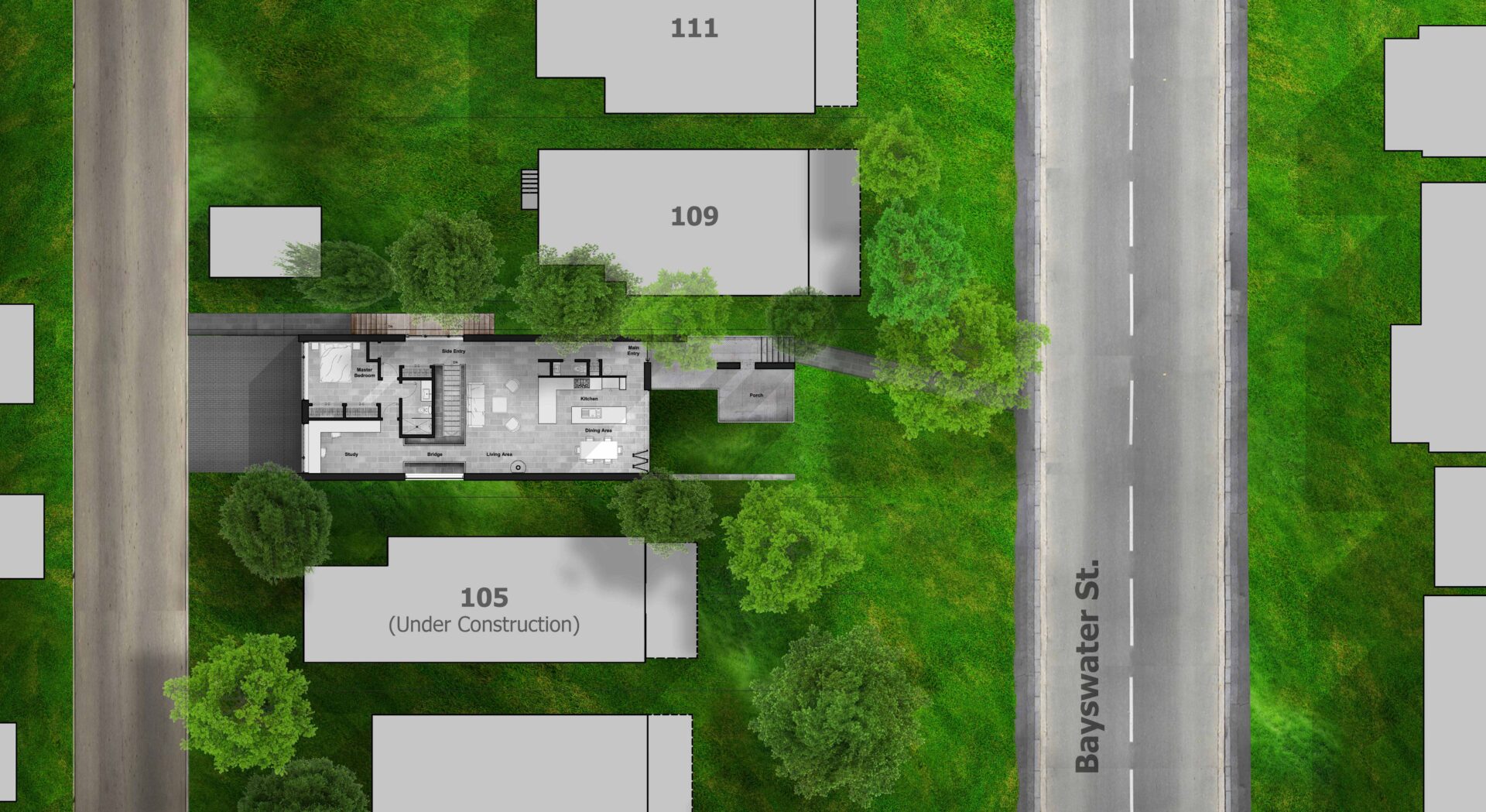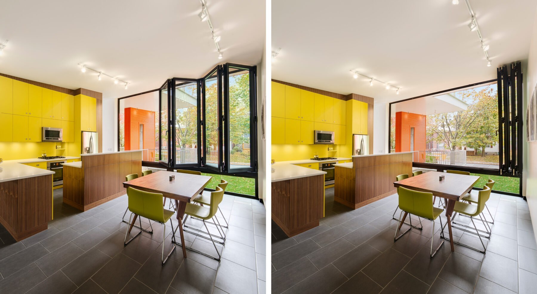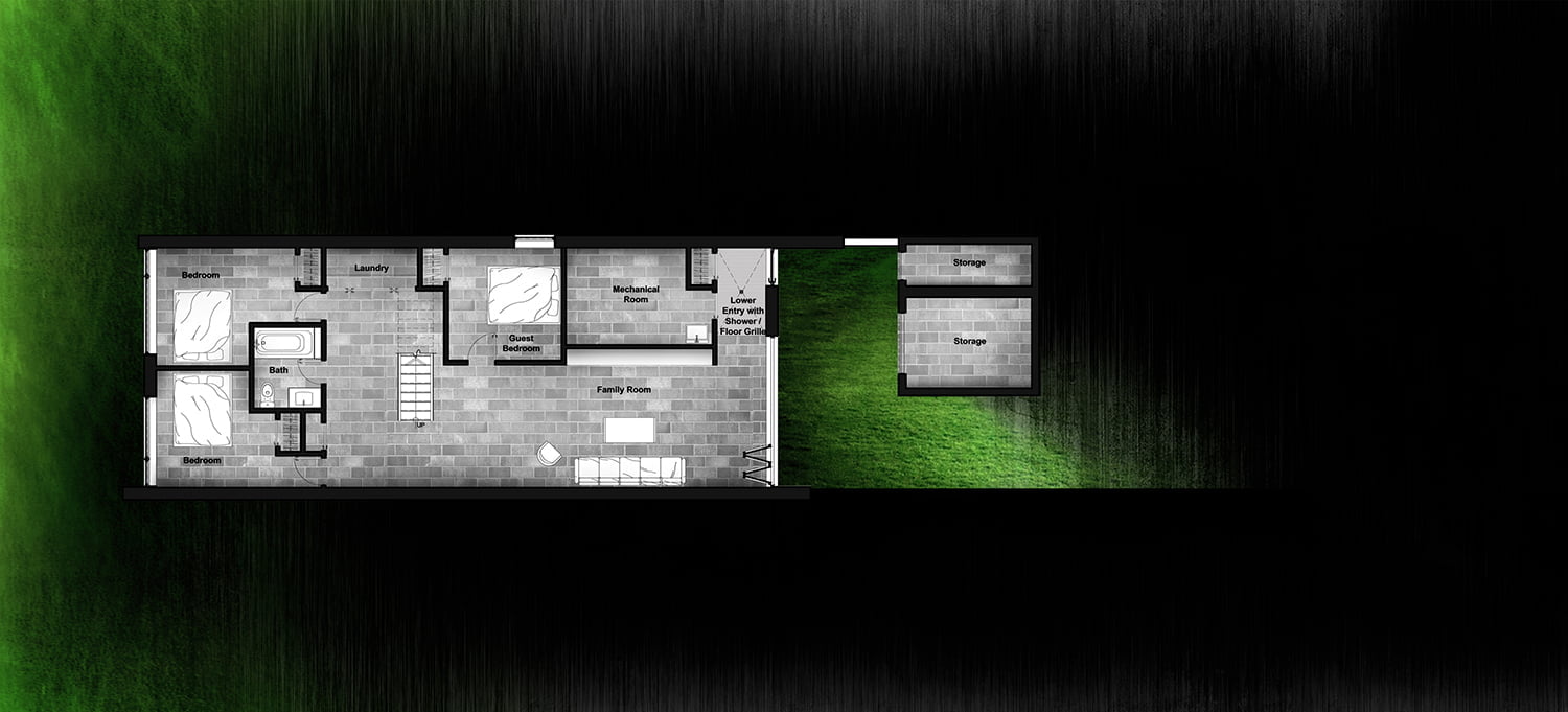 Light was a major consideration. We started by setting the home as far back as possible within a landscape that was shaped along with the architecture, effectively turning the “basement” into a tall volume of space that opens to the light and views of the front garden. Meanwhile, the front wall features a floor-to-ceiling glass accordion-door system that completely opens to the landscape.